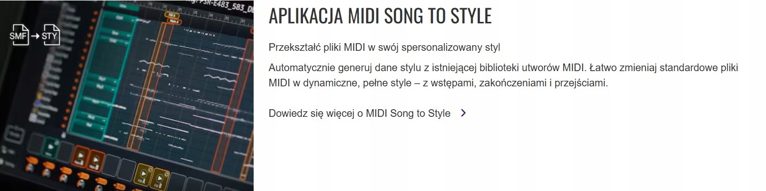 Przekształć pliki MIDI w swój spersonalizowany styl. Automatycznie generuj dane o stylu z istniejącej biblioteki utworów MIDI. Z łatwością zmieniaj standardowe pliki MIDI w dynamiczne, pełnoprawne style, wraz ze wstępem, zakończeniem i przejściami.