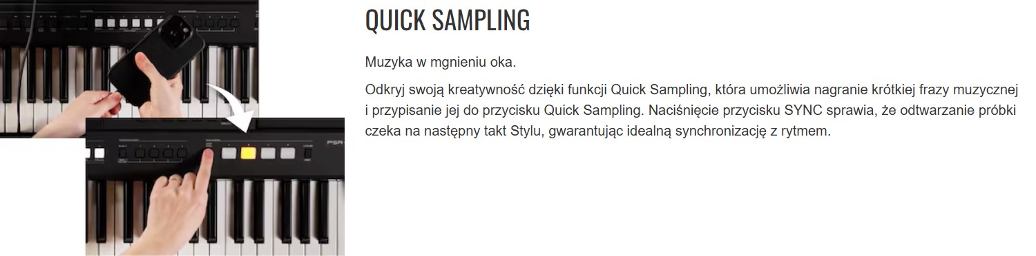 Szybko rozpocznij odtwarzanie muzyki. Odkryj swoją kreatywność dzięki funkcji Szybkiego Próbkowania, która umożliwia nagranie krótkiej frazy muzycznej i przypisanie jej do przycisku Szybkiego Próbkowania. Po naciśnięciu przycisku SYNC odtwarzanie Szybkiego Próbkowania będzie czekać do następnego taktu stylu, gwarantując, że próbka rozpocznie się dokładnie w odpowiednim momencie.
