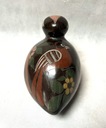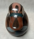 Ma brązowe, glazurowane wykończenie z kolorowymi motywami kwiatowymi i geometrycznymi.