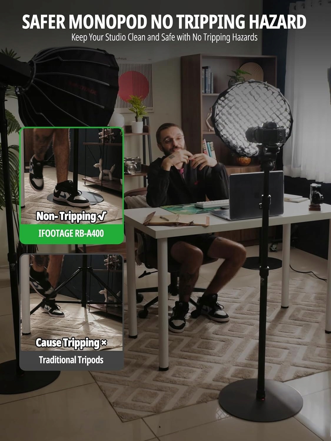 Regulacja wysokości i duża pojemność : Okrągła płyta podstawowa ma regulowaną wysokość do 201,6 cm, posiada antypoślizgowy i odporny na zarysowania materiał pod wózkiem i zapewnia niezawodne i stabilne obciążenie do 10 kg. Statyw jednonożny z okrągłą podstawą firmy iFootage to idealne rozwiązanie do obsługi kamer i akcesoriów do zdjęć na stole lub biurku.