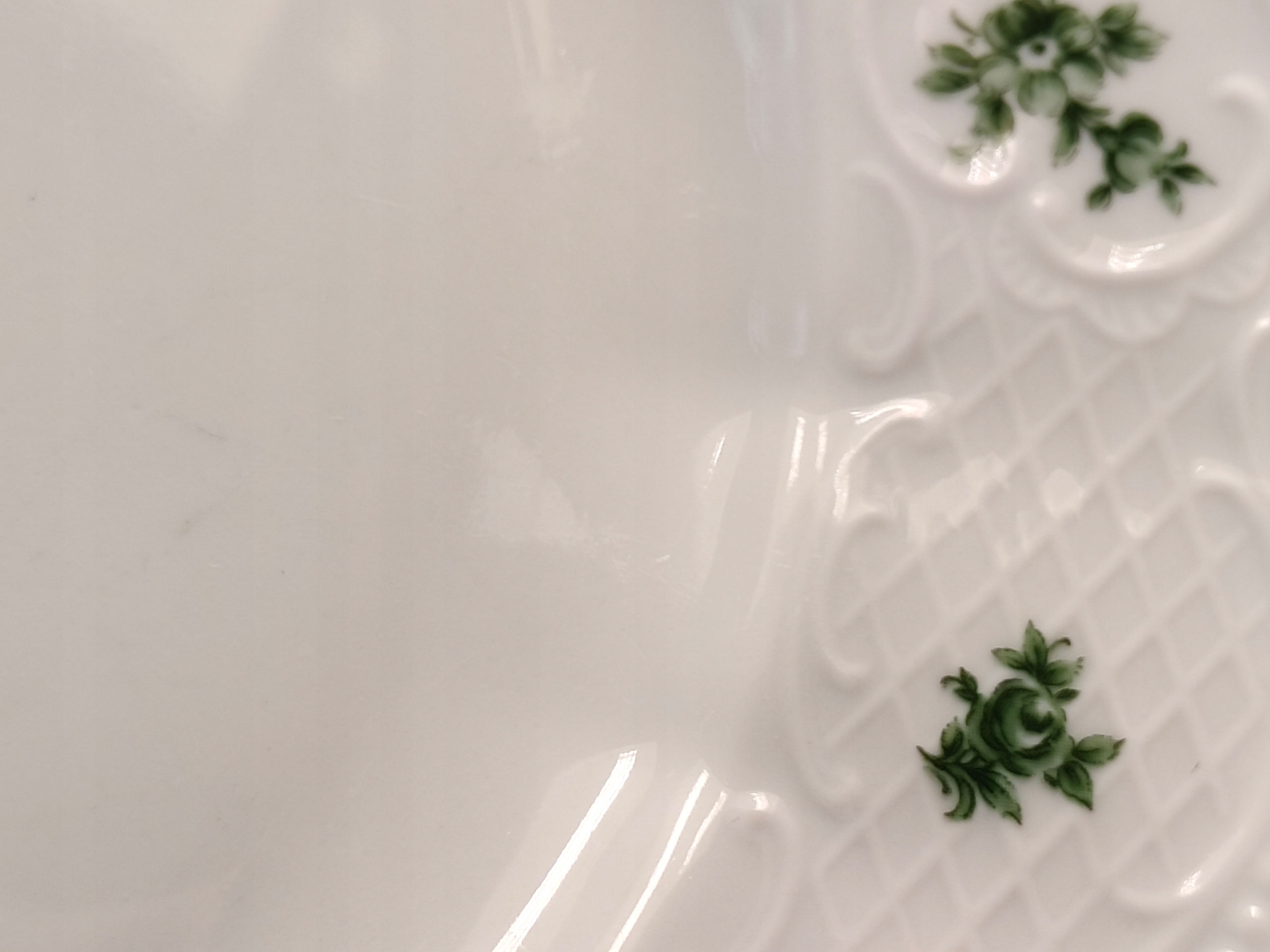 Przepiękna biała porcelana bogato reliefowana zdobiona w zielone kwiaty.