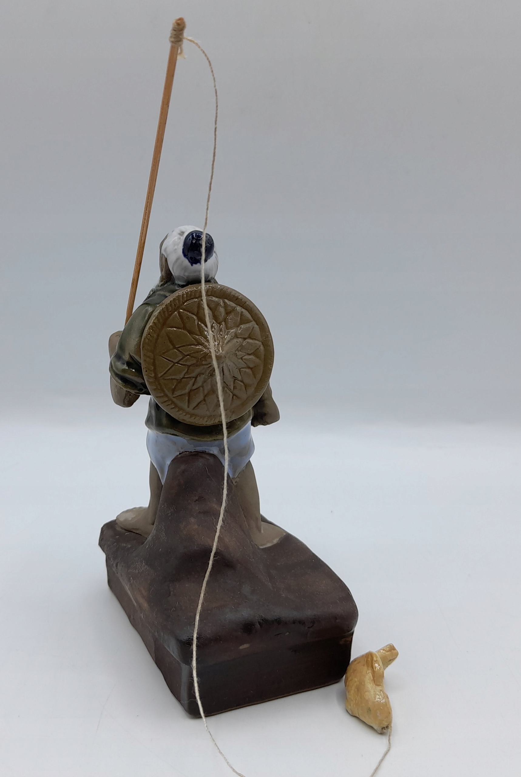 Wykonana z gliny/ceramik, częściowo szkliwiona. Wędka z drewna. Wymiary tej: 10,5cm/7,3cm/5cm, waga 150 gram. Na żywo prezentuje się równie przepięknie jak na zdjęciach. Stan IDEALNY - żadnych wad. Figurka STARA, vintage, kolekcjonerska.