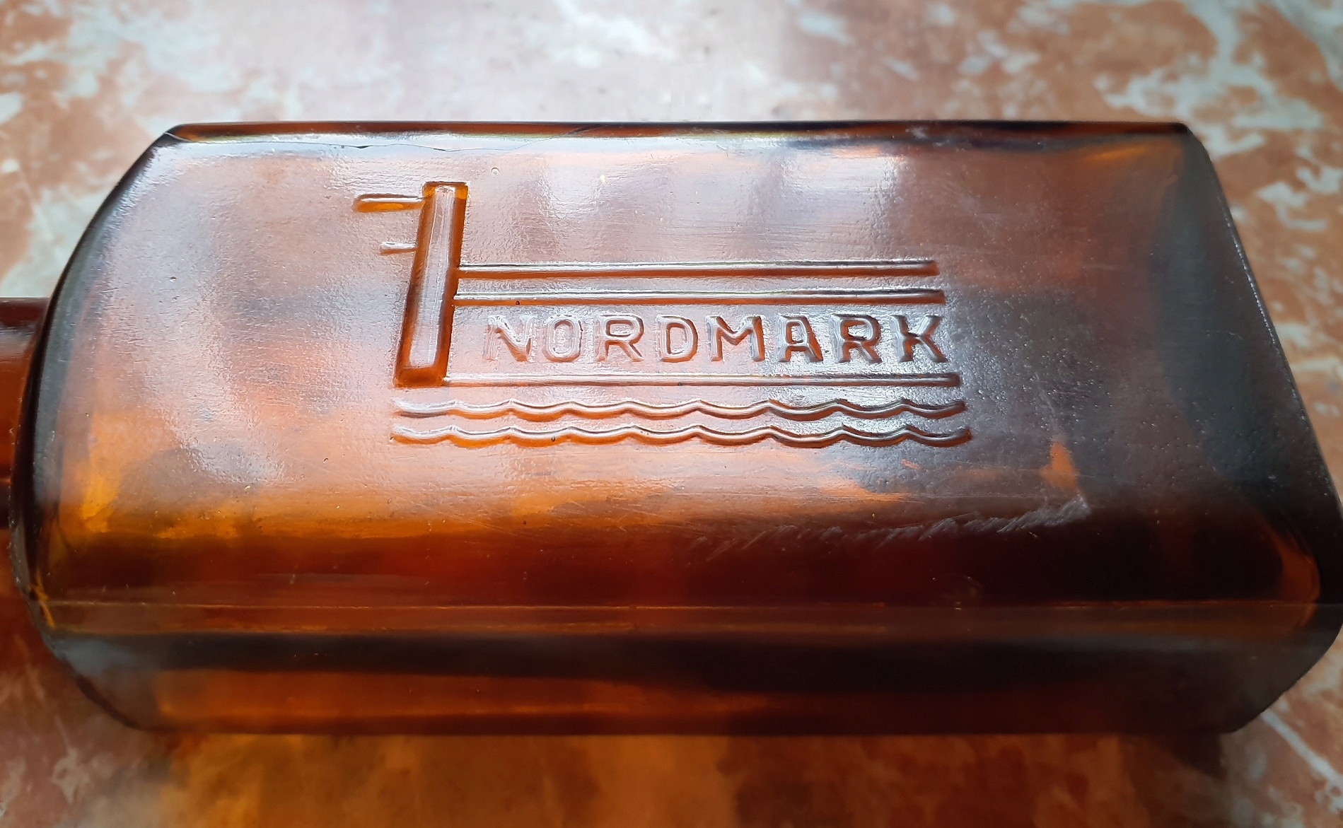 buteleczki apteczne firmy NORDMARK , wszystko oryginalne przedwojenne znaleziska., duża ma poj. ok. 0.3L i ma 5-cio milimetrowy odprysk na rancie, zaznaczony strzałką , pozostałe buteleczki ładne, każda jest inna - poj. ok. 50 ml., stany takie jak widoczne na zdjęciach.