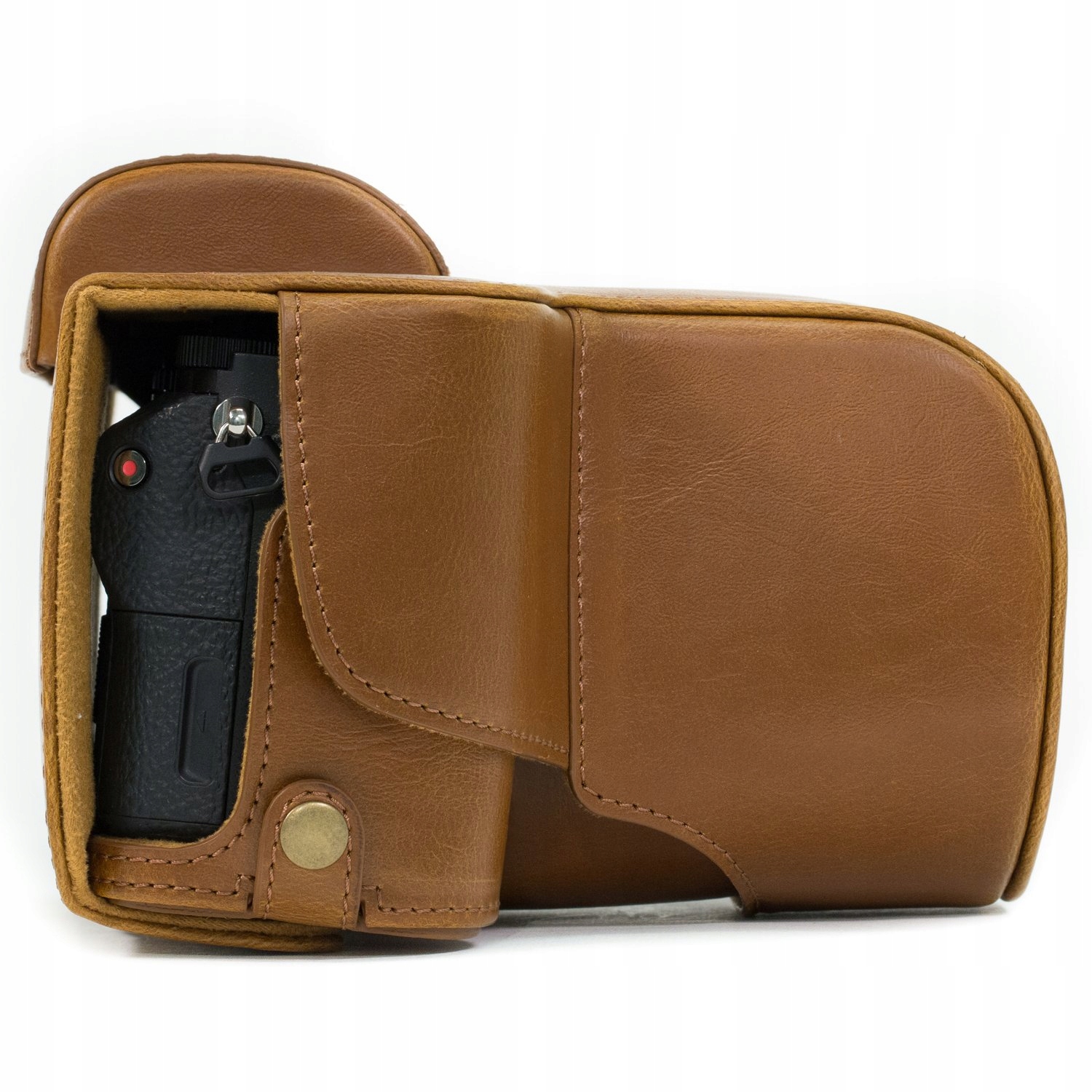 Etui wykonane jest ze skóry syntetycznej najwyższej jakości typu PU Leather. Wnętrze pokrowca posiada miękką wyściółkę, chroniąc aparat i obiektyw przed zarysowaniami oraz kurzem. Wszystkie elementy zostały starannie dopasowane, dzięki czemu etui pewnie przylega do aparatu, nie przesuwając się podczas użytkowania.