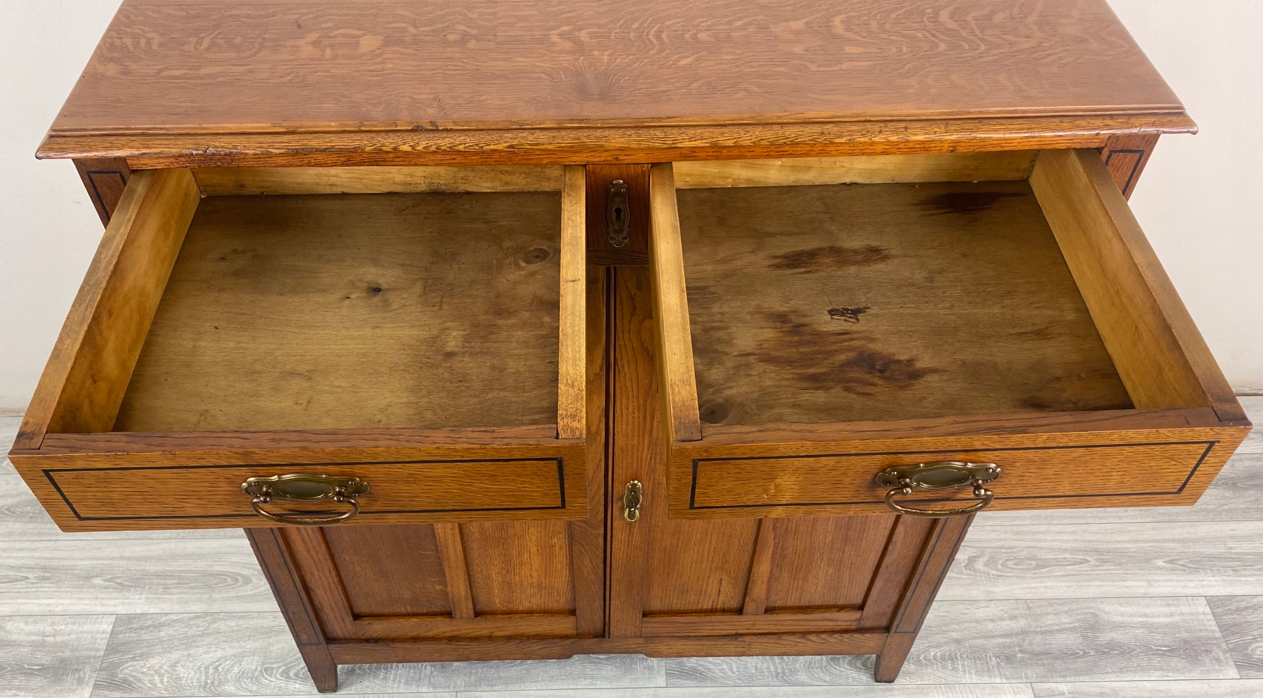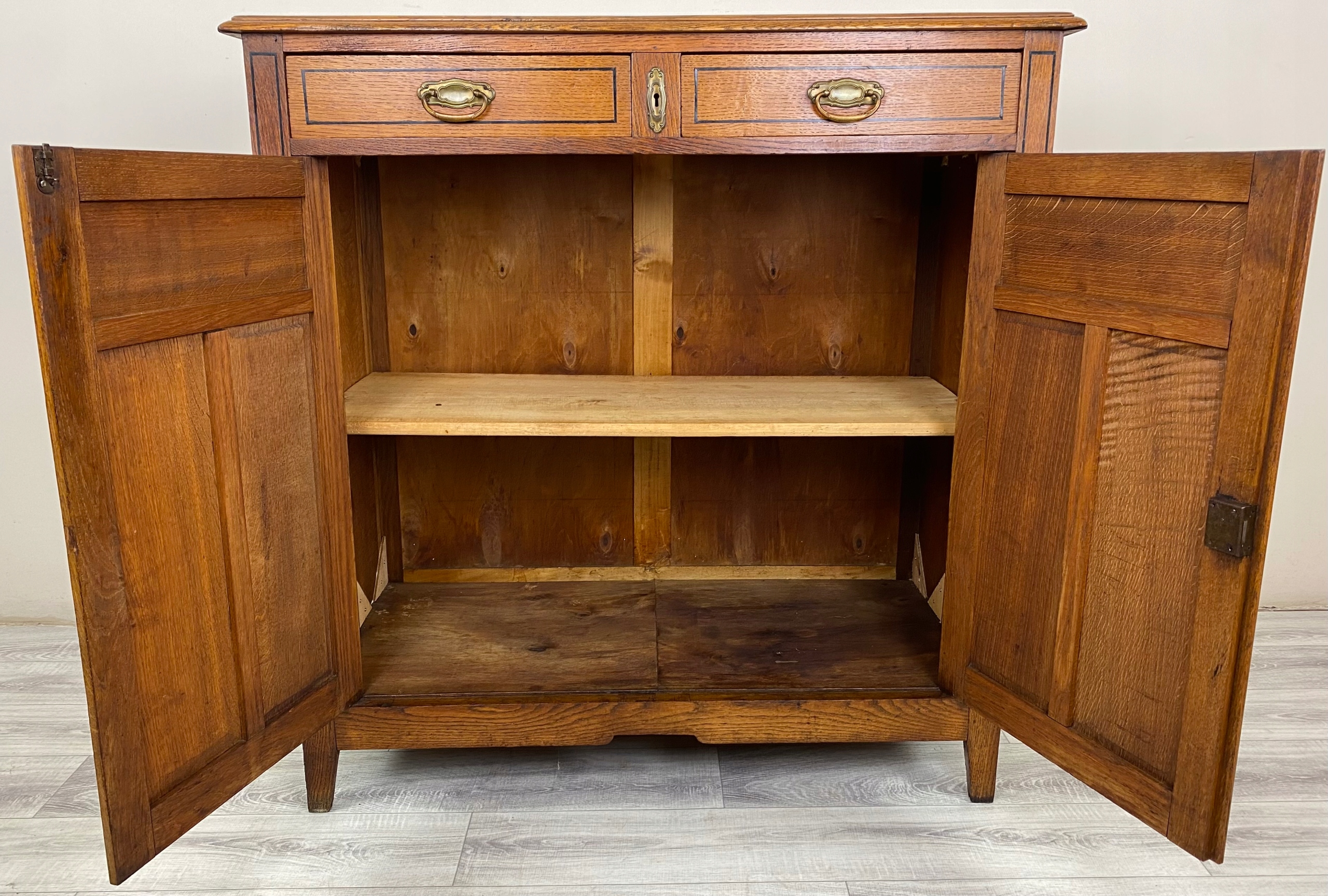 Szafka posiada dwa uchylne fronty. Wewnątrz półka. Dodatkowo dwie szuflady.
