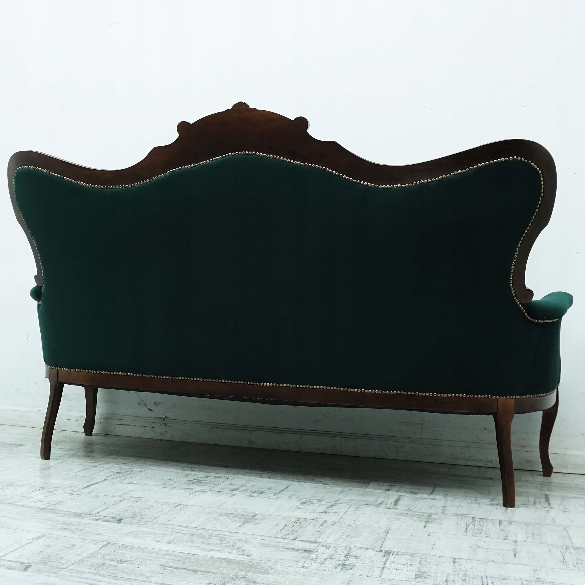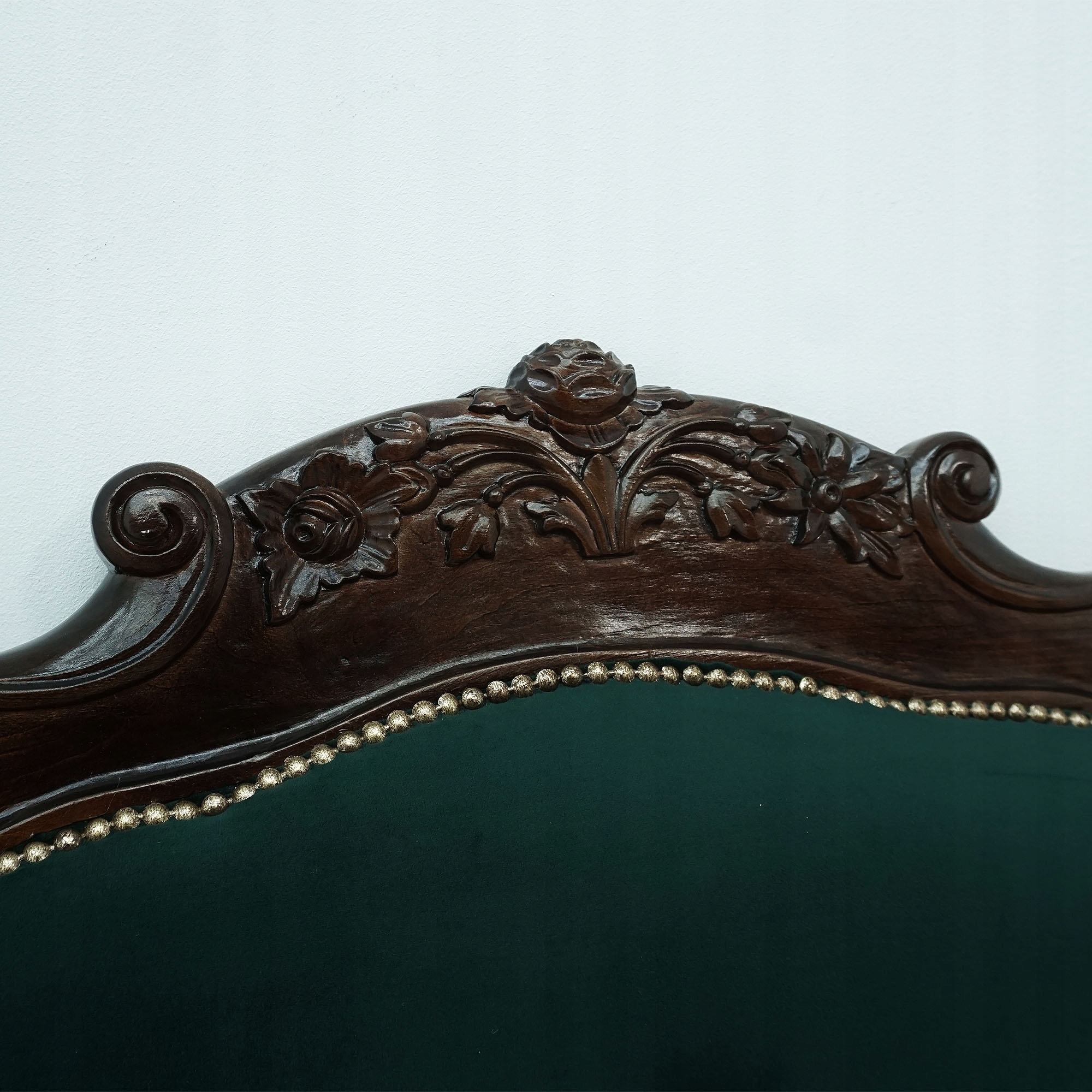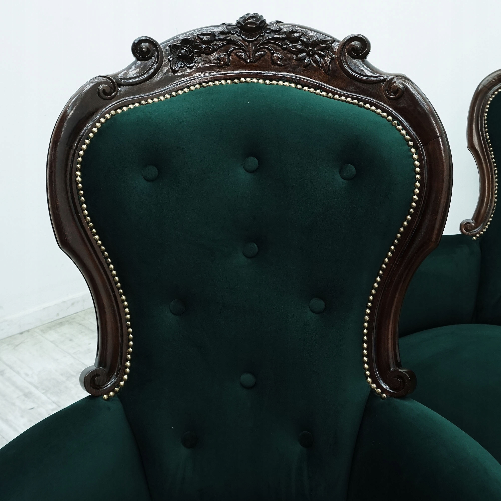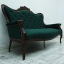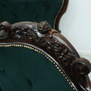 Tapicerka w głębokim, butelkowozielonym kolorze nadaje wnętrzu klasy i prestiżu, a pikowane oparcia podkreślają klasyczny charakter mebla. Solidna, rzeźbiona konstrukcja z ciemnego drewna zachwyca dbałością o detale i kunsztem wykonania. Ozdobne wykończenia oraz dekoracyjne gwoździe tapicerskie dodają całości wyrafinowanego stylu.