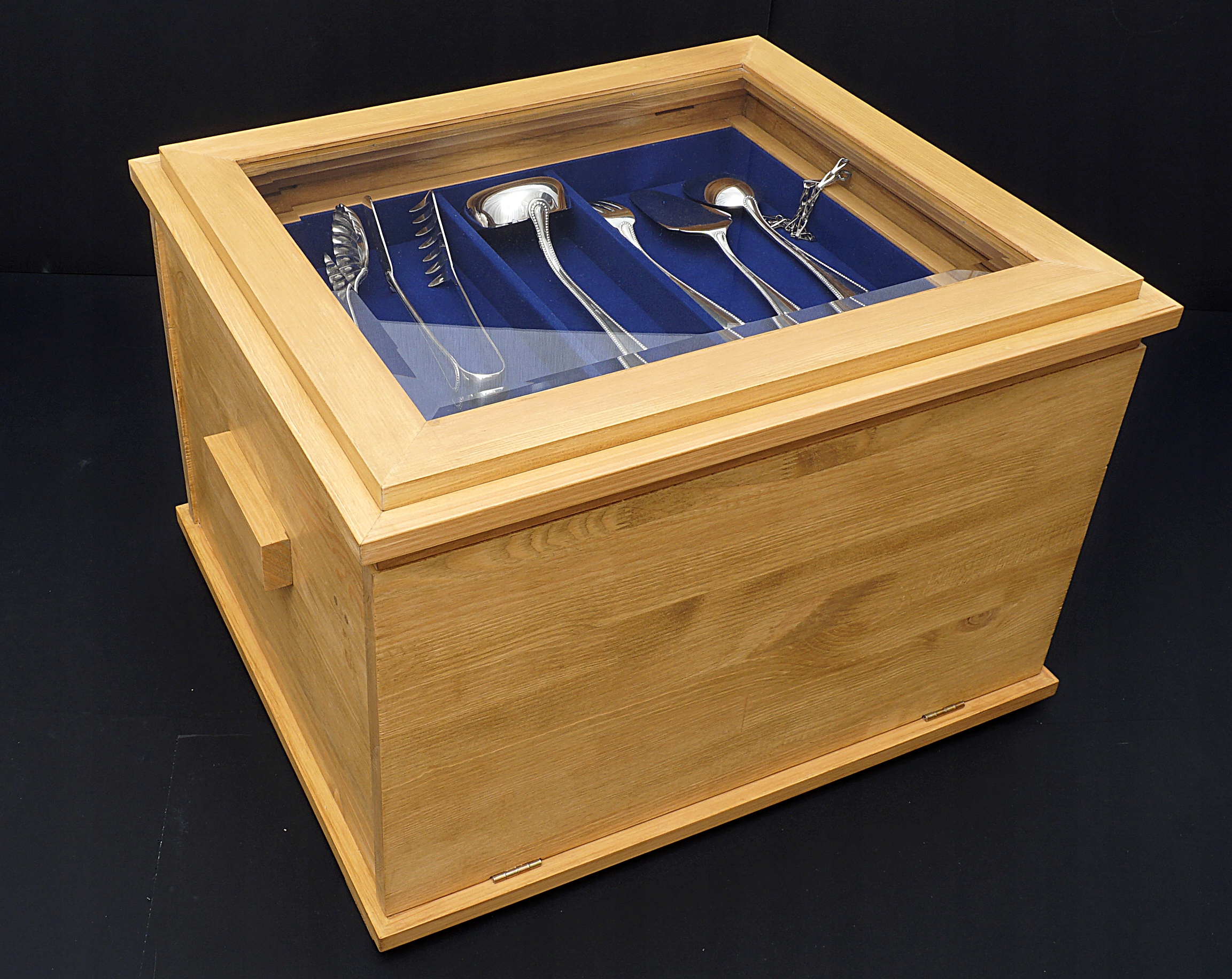 Stan kompletu bardzo dobry. Sztućće znajdują się w nowej, sosnowej skrzyni. Szuflady wyłożone są granatowym aksamitem.