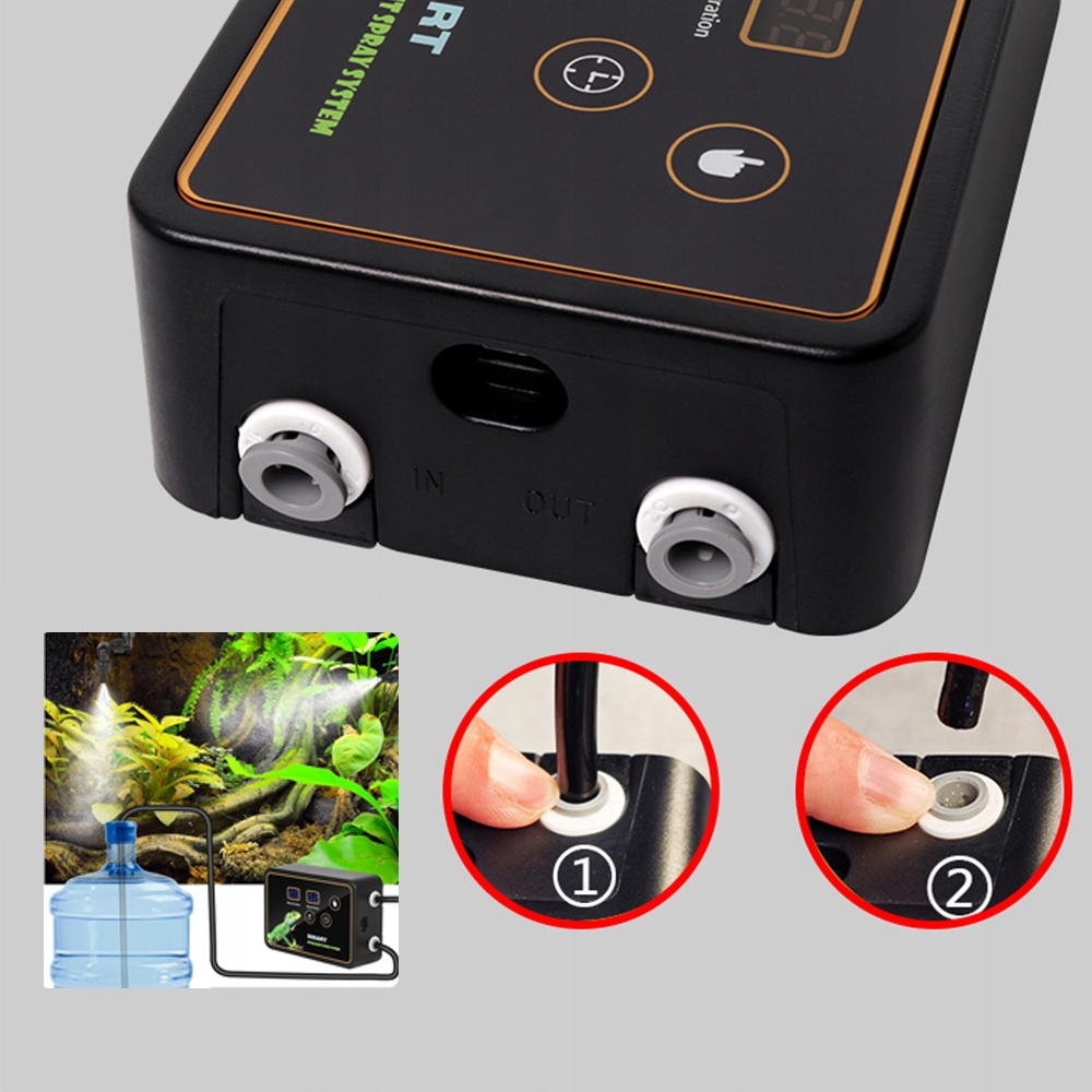 Inteligentny system nawadniania dla gadów jest szybki i łatwy w montażu. W przeciwieństwie do tradycyjnych nawilżaczy, nasz opryskiwacz dla gadów nie posiada pojemnika na wodę. Można go skonfigurować z nieużywanym wiadrem lub dowolnym zbiornikiem na wodę. Wystarczy włożyć filtr do wiadra, aby go podłączyć. Prosta instalacja i przyjazny dla użytkownika interfejs sprawiają, że konfiguracja systemu jest dziecinnie prosta, nawet dla niedoświadczonych użytkowników.
