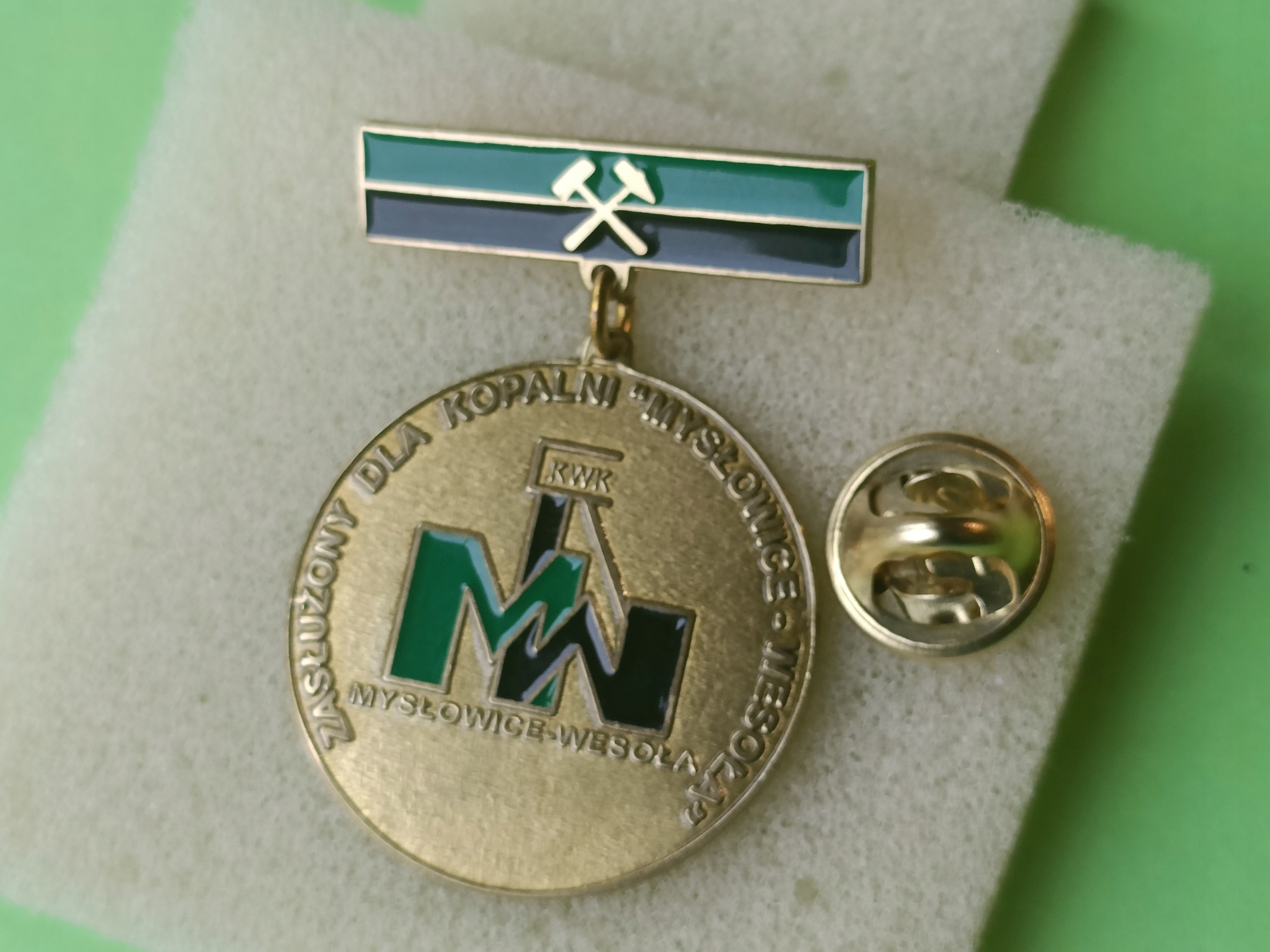 Oryginalny Odznaka Górnicza - ZASŁUŻONY DLA KOPALNI "MYSŁOWICE-WESOŁA" - złota, ( nieużywana), wymiary średnica - 28 mm, z zawieszką - 40 mm. ( stan jak na zdjęciach, nowy, mocowanie pins)
