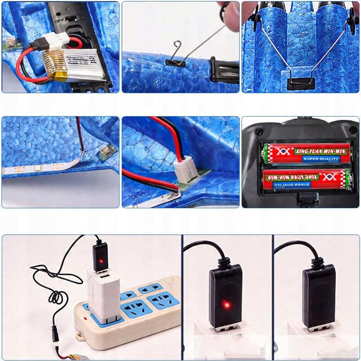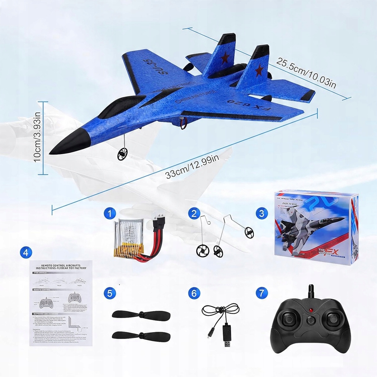 ✔️【Zakres dostawy】1 x samolot FX 620 (niebieski), 1 x pilot zdalnego sterowania (wymaga 2 baterii AA, brak w zestawie), 1 x przednie podwozie, 1 x tylne podwozie, 2 x akumulator LiPo 3,7 V 150 mAh, 1 x kabel do ładowania USB, 2 x zapasowe śmigła, 2 x samoprzylepny łańcuch świetlny, 1 x instrukcja obsługi.