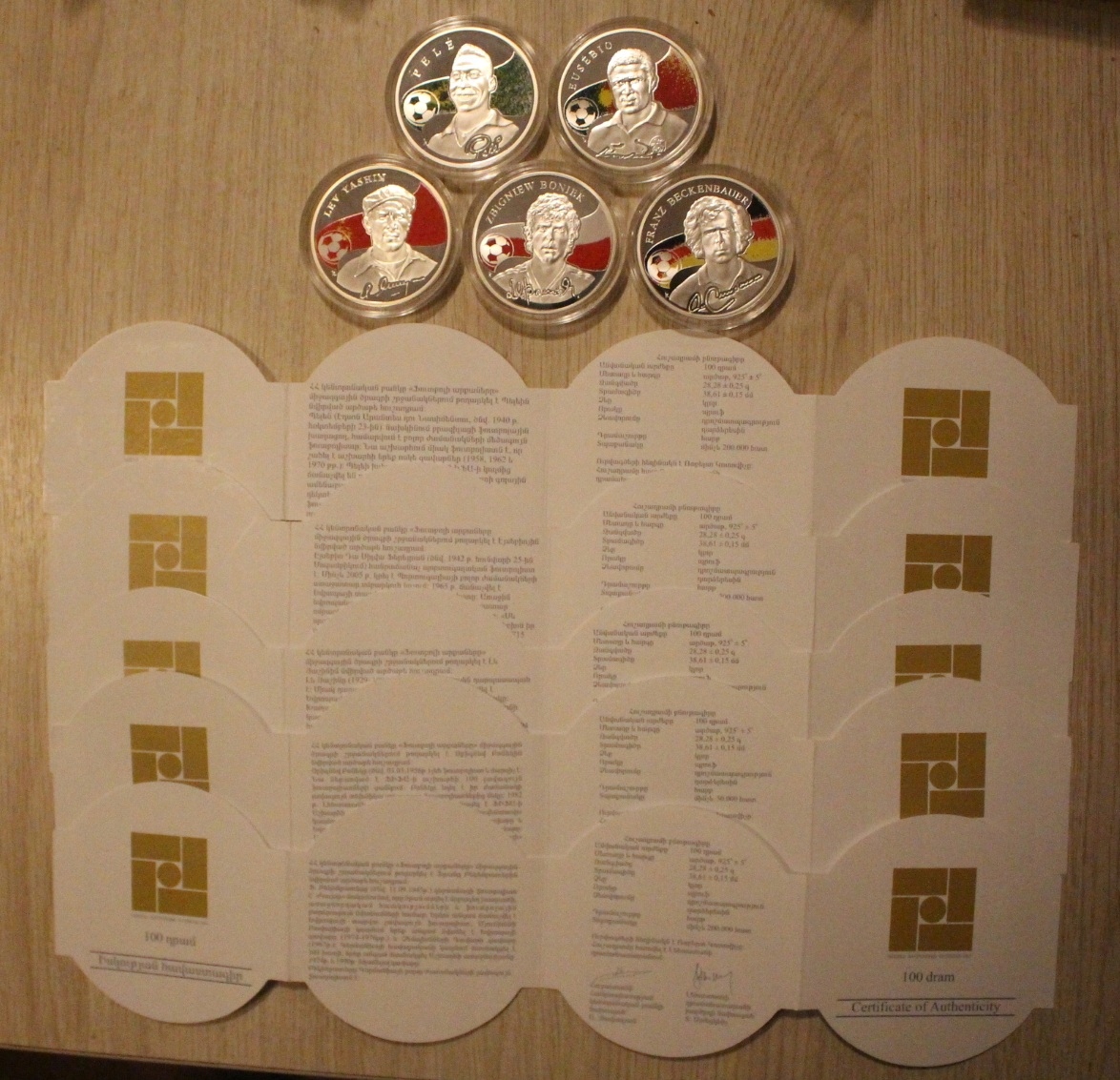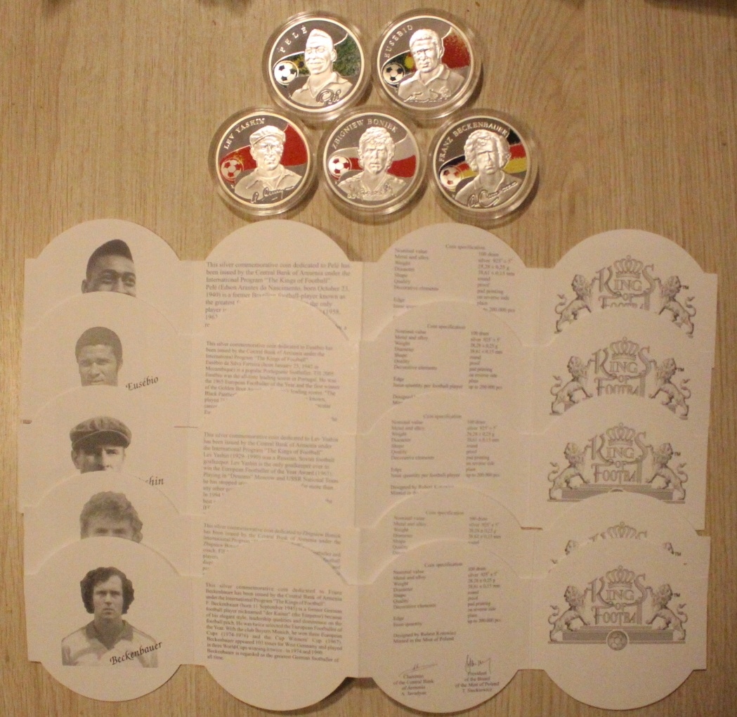 ZAPRASZAM DO KUPNA ŁADNEGO ZESTAWU 5 MONET 100 DRAM 2008 - 2009 ARMENIA Z PIĘKNEJ SERII 8 MONET "KINGS OF FOOTBOL" - KRÓLOWIE FUTBOLU, DO KAŻDEJ MONETY DOŁĄCZONY JEST ORYGINALNY DWUJĘZYCZNY CERTYFIKAT - 5 ORYGINALNYCH CERTYFIKATÓW - RZADKOŚĆ. W SKŁAD ZESTAWU WCHODZĄ : EUSEBIO, PELE, ZBIGNIEW BONIEK. LEW JASHIN i FRANZ BECKENBAUER, WAGA 1 ( JEDNEJ ) MONETY 28,28 GRAM - SREBRO PRÓBY 925, ŚREDNICA 38,61 mm, STAN MONET MENNICZY. MONETY POCHODZĄ Z MOJEJ PRYWATNEJ KOLEKCJI. STAN WIDOCZNY NA ZDJĘCIU.