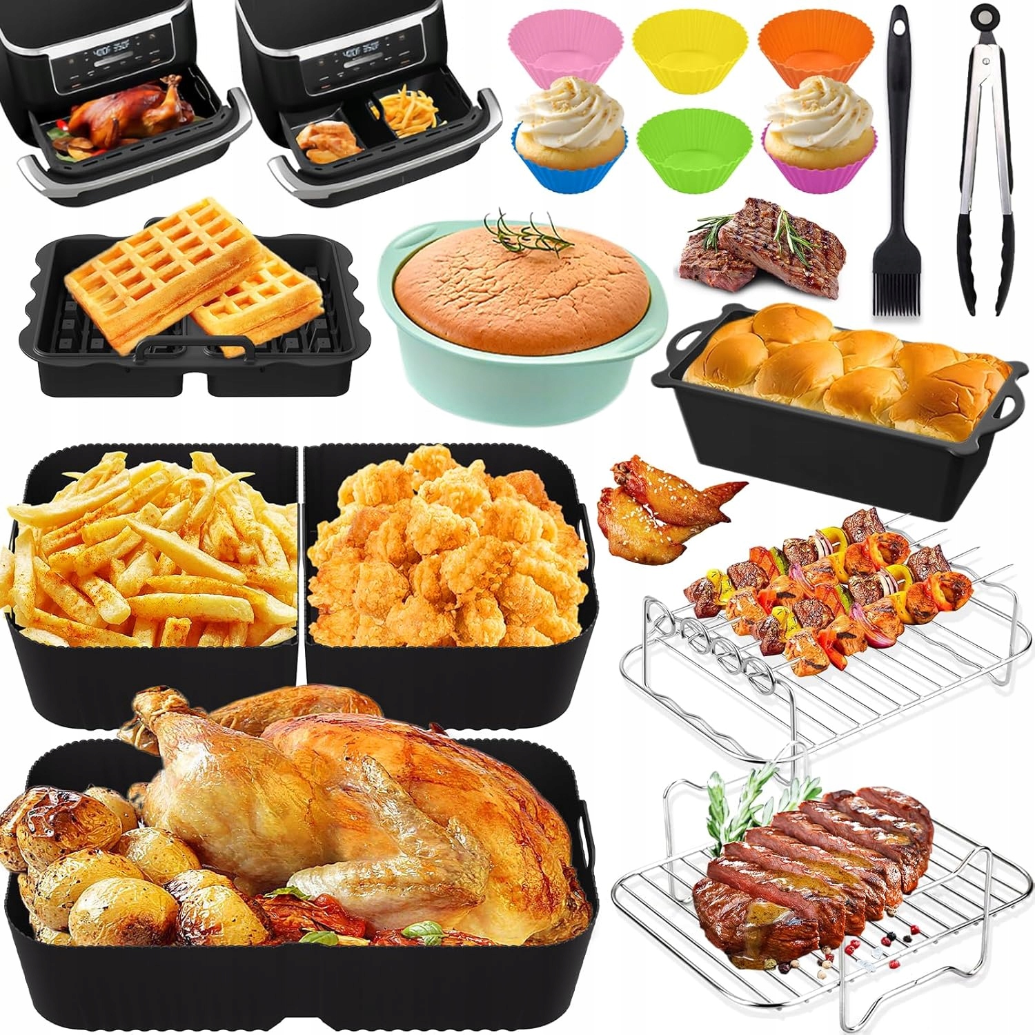 Odkryj wszechstronny zestaw akcesoriów do frytkownicy na gorące powietrze Cosori Dual Blaze Twinfry XXL 10 L. Dopasowany idealnie do modeli COSORI 10 L (2 × 5 L i 1 × 10 L), zapewnia wygodne gotowanie, większą pojemność i lepszą odporność na rozpryski oleju. Dzięki niemu przygotujesz chrupiące frytki, soczyste mięsa, aromatyczne warzywa i domowe wypieki w prosty i zdrowy sposób.