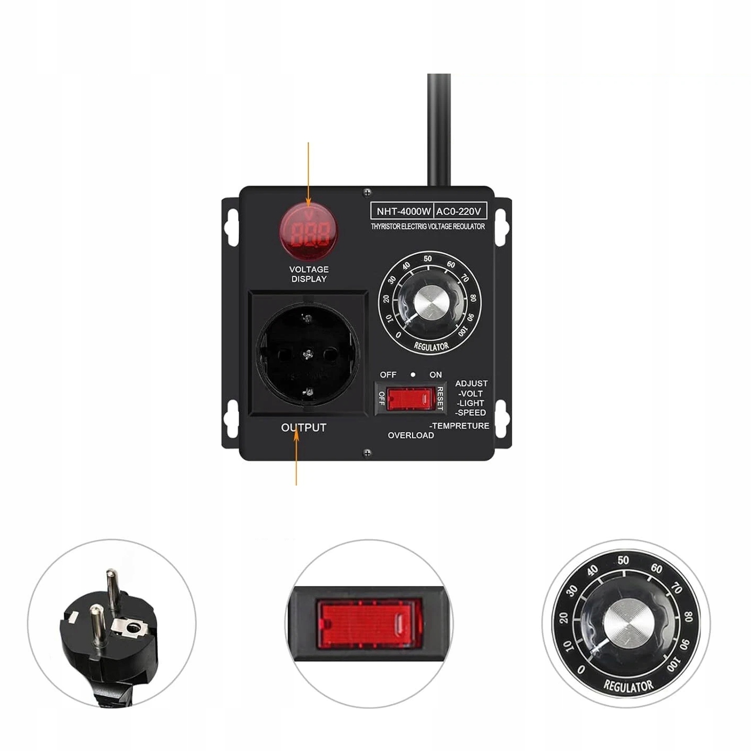 Napięcie wyjściowe: 0–220 V AC, płynna regulacja (woltomierz nie działa, gdy napięcie jest poniżej 10 V) Regulowany zakres napięcia: 0–220 V AC