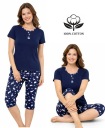 Koszulka z krótkim rękawem posiada dekolt wykończony lamówką w kolorze spodenek oraz ozdobny nadruk. Wielokolorowe spodenki za kolano posiadają w pasie nieuciskającą gumę. Piżama zapewnia wysoki komfort noszenia w dzień oraz podczas snu. Kupując ten produkt, masz pewność, że jest on najwyższej jakości.