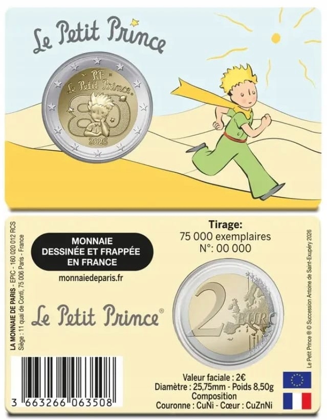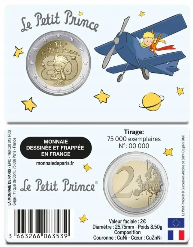 Pierwsza francuska moneta okolicznościowa wyemitowana przez mennicę paryską w 2026 roku świętuje 80. rocznicę publikacji "Małego Księcia" Antoine’a de Saint-Exupéry’ego we Francji. Blister w 4 różnych wersjach graficznych: pustynia - kolor żółty, samolot - kolor błękitny, chmura - kolor granatowy , książka - kolor różowy. Wariant blistra wybrany losowo lub wskazany w uwagach.