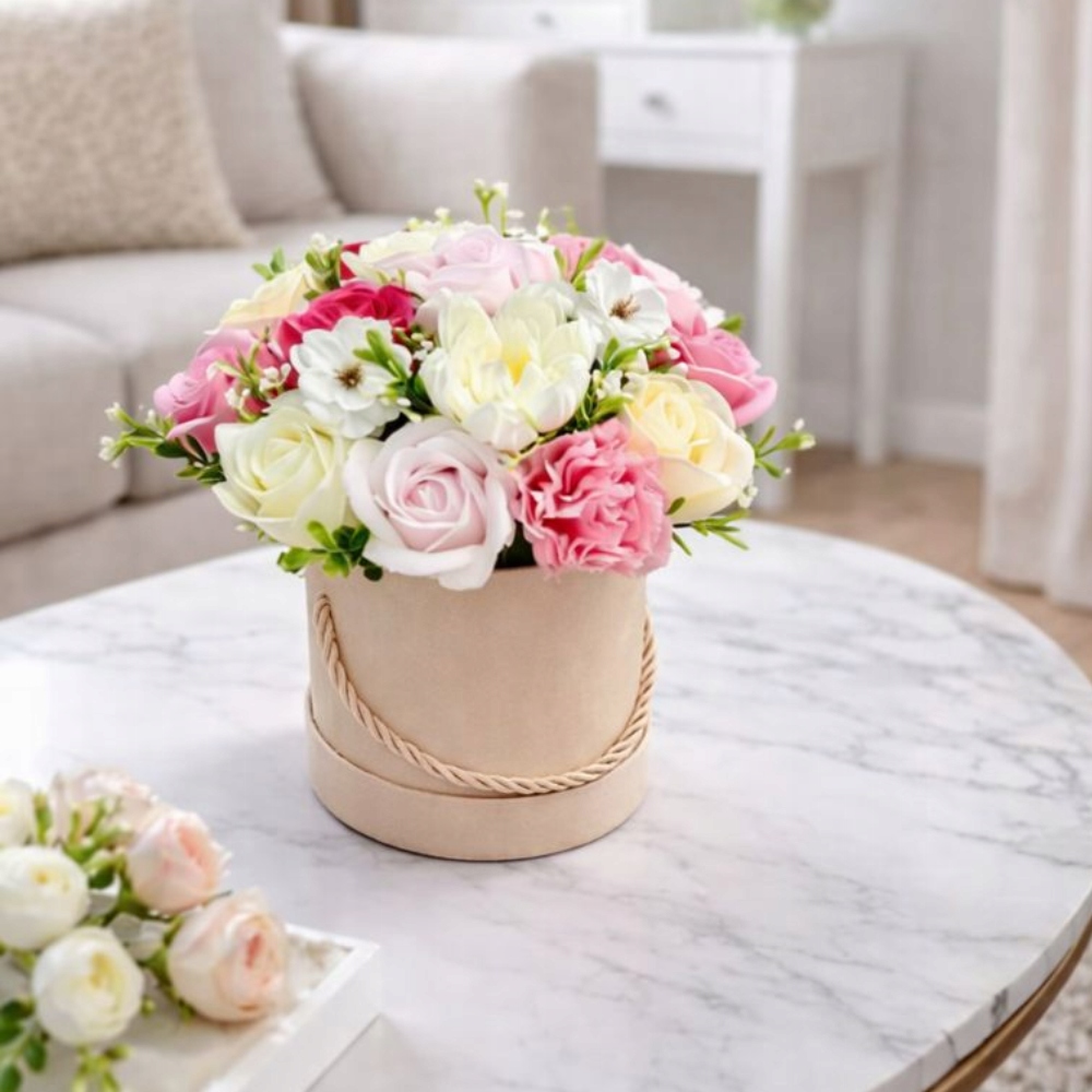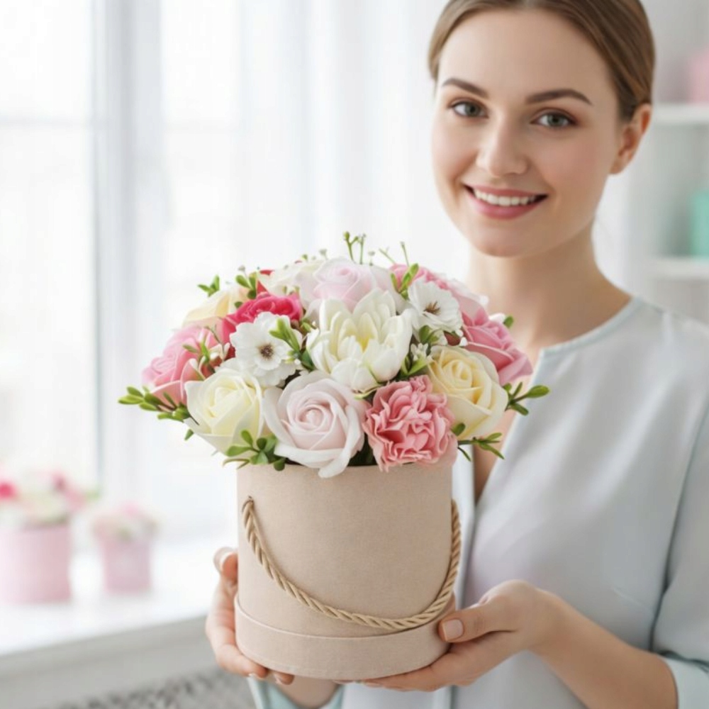 ❤️ Prezentowany flowerbox to starannie skomponowana aranżacja z kwiatów mydlanych najwyższej jakości — realistycznych, delikatnych w dotyku i trwałych w swojej formie. Ich intensywne kolory, harmonijne zestawienie odcieni oraz estetyczne ułożenie tworzą bukiet, który wygląda jak prawdziwe kwiaty — ale daje dużo więcej korzyści.