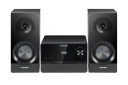 Mikrowieża z wbudowanym tunerem DAB+ zapewniającym krystalicznie czysty odbiór radia cyfrowego oraz mocą 100 W RMS (2 × 50 W) i maksymalną mocą wyjściową 300 W, gwarantuje wysoką jakość dźwięku w każdym wnętrzu. Urządzenie wyposażone jest w odtwarzacz CD (MP3/WMA), radio FM PLL z RDS, port USB oraz łączność Bluetooth do bezprzewodowego strumieniowania muzyki. Dzięki złączom HDMI ARC, wejściu optycznemu oraz AUX można je łatwo podłączyć do telewizora i innych urządzeń. System oferuje korektor dźwięku z trybami (Music, Game, News, Movie), regulację basów i tonów wysokich, funkcję Loudness, a także zegar z alarmem. Czytelny wyświetlacz LED oraz pilot zdalnego sterowania sprawiają, że obsługa jest prosta i wygodna.