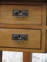 Mebel oczyszczony ze starych powłok , pomalowany lakierem w miodowym odcieniu brązu . Środek oczyszczony można pomalować bejcą .Widoczne delikatne ślady użytkowania , okucia oryginalne stare , biurko wykonane z litego drewna blat sosnowy nogi dębowe .