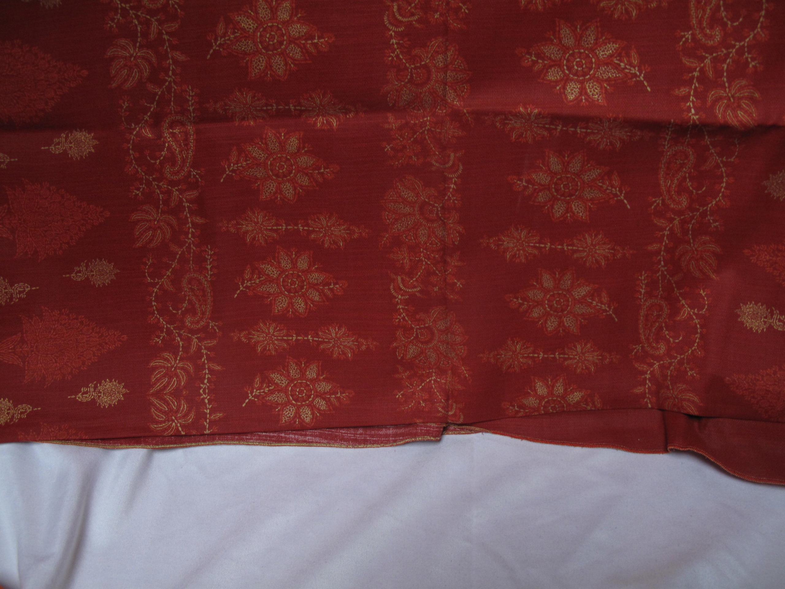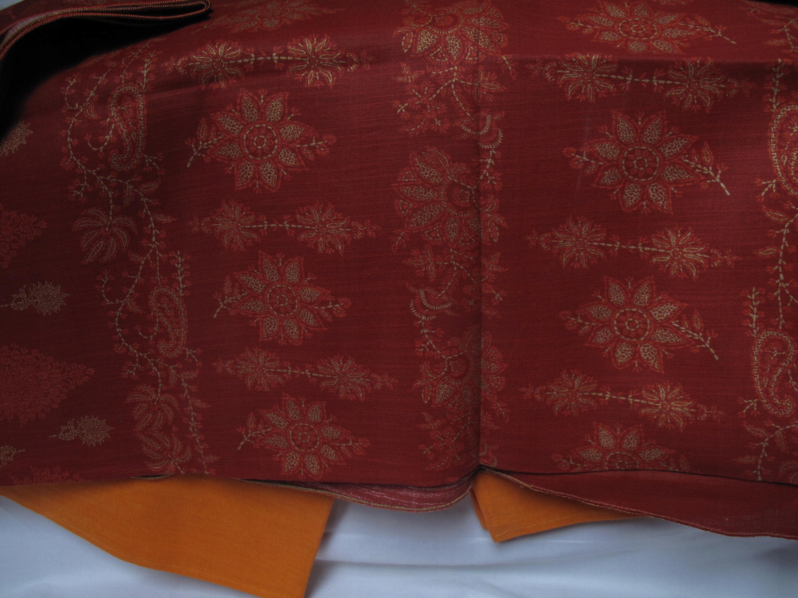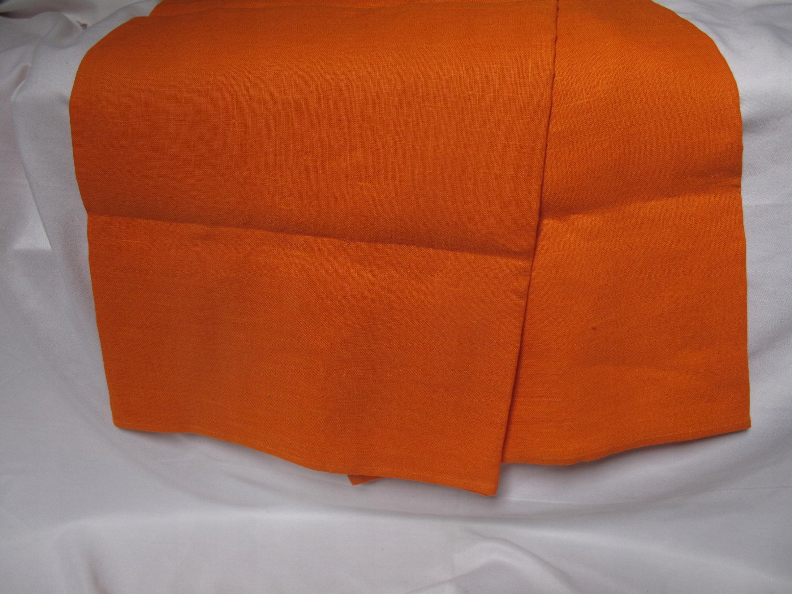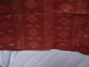 Tkaniny na moich aukcjach na ogół nie posiadają metek ani sygnatur / jeżeli mają zawsze je przedstawiam/, kieruję się wyłącznie własnym oglądem, mogę się mylić w ocenie materiału / prawdziwy czy sztuczny/ . Obrus lniany pomarańczowy ma 232 x 110 cm, len grubszy, gładki, ciężki, nowy i nowy obrus bawełniany, czerwony z złoconym wzorem, ma 140 x 148 cm.