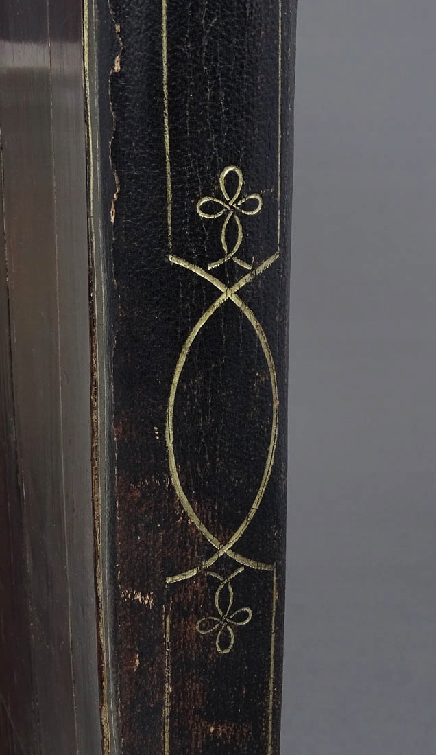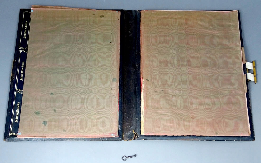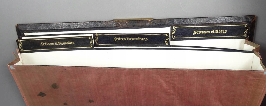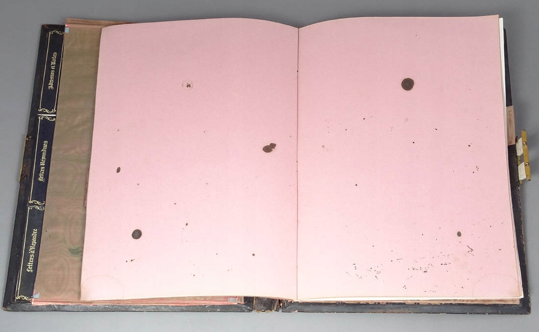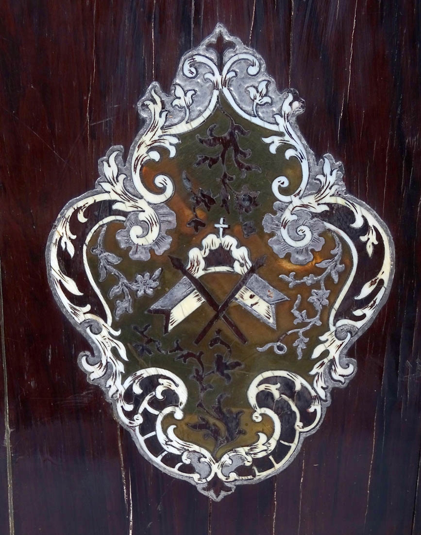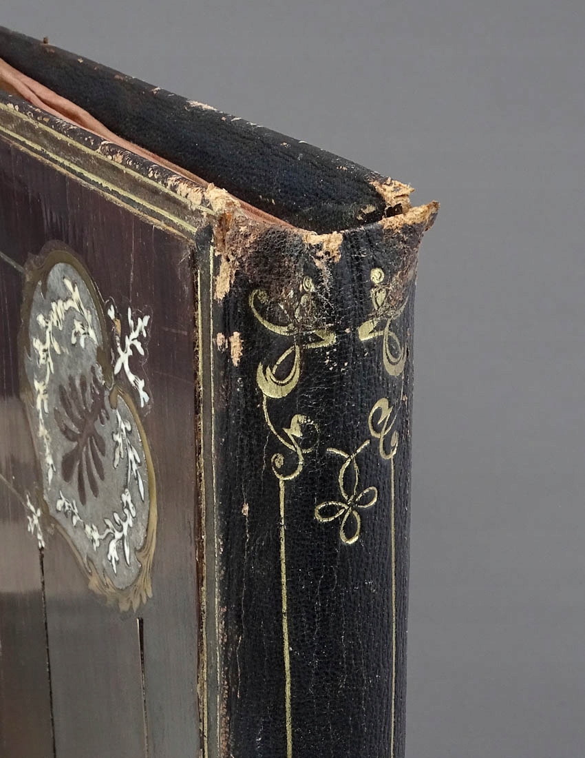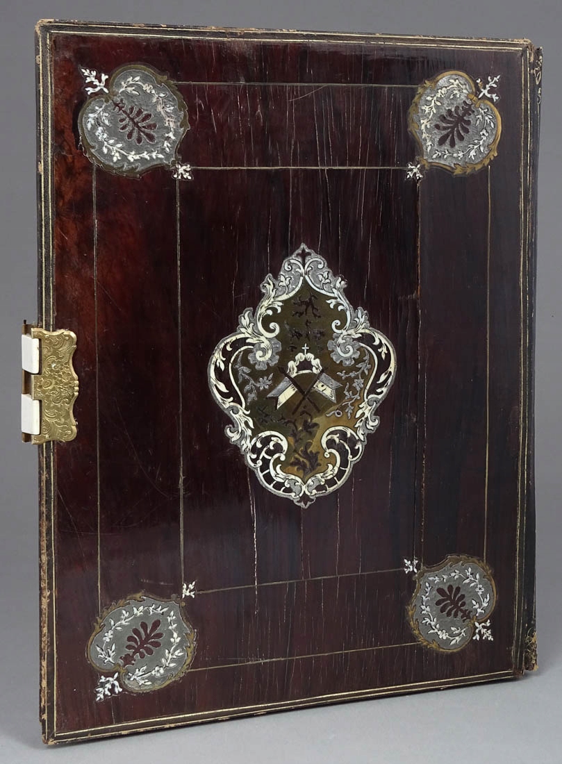 Na frontowej stronie bardzo wysokiej jakości markieteria w formie wici roślinnych, gałązek z pąkami kwiatów, wzorami rocaillowymi, malutkich muszelek, a na środku rozetką z czterema koronami z kości. Na odwrocie w każdym z narożników splecione girlandy z blachy mosiężnej i kości, na środku większy inkrustowany element z dwiema flagami. Wszystko to połączone tłoczoną, złoconą skórą, zaś wewnątrz pergaminowe strony na dokumenty z opisami, zdobione jedwabnym materiałem. Całość zamykana rylcowanym zameczkiem, sprawnym, z zapinkami z kości i kluczykiem w zestawie.