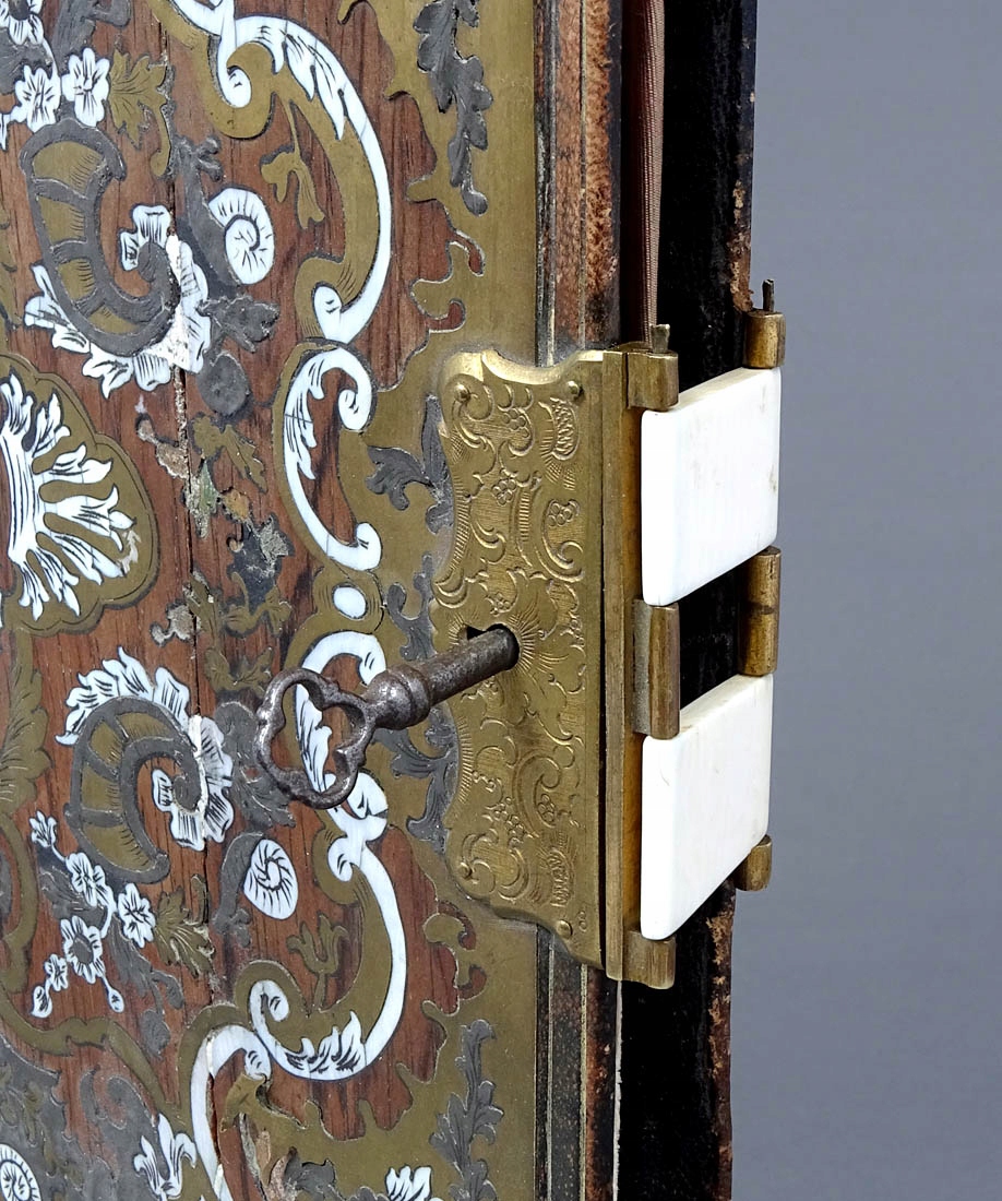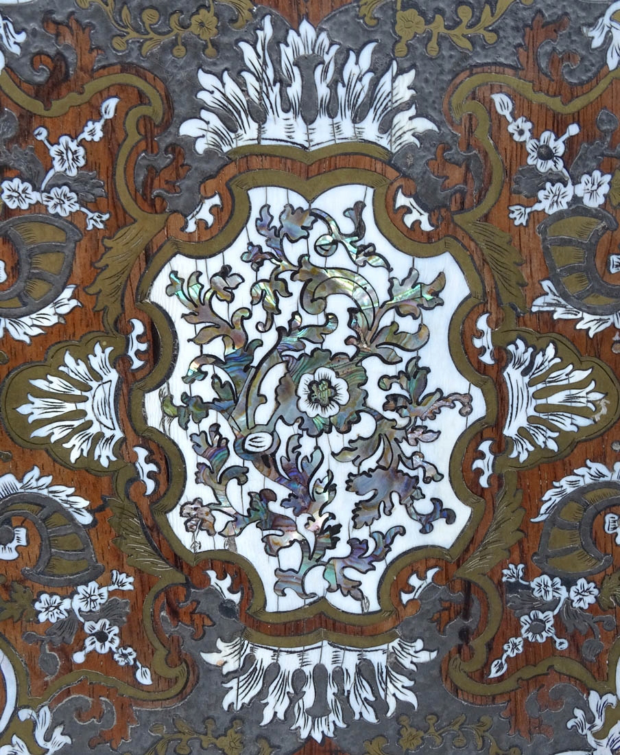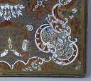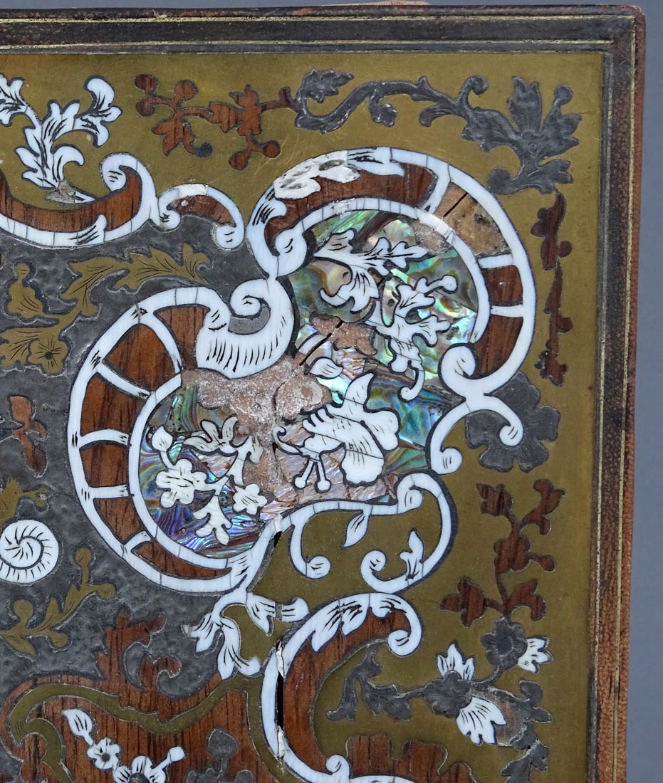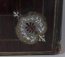 Inkrustacja z blachy mosiężnej i cynowej, masa perłowa, kość, konstrukcja drewno palisandrowe, pergamin i jedwab. Francja połowa XIX w.