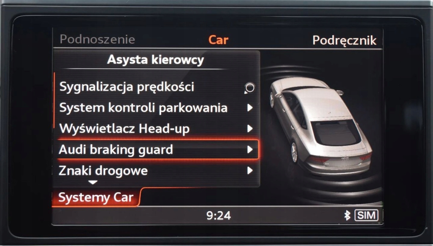 Pakiet Assistance obejmujący Audi pre sense plus (system wspomagania parkowania z przodu i z tyłu, asystent wizualny (APS Plus), asystent zmiany pasa ruchu (Side Assist) z systemem Audi pre sense rear, adaptacyjny tempomat z funkcją Stop&Go z systemem Audi pre sense front, asystent utrzymania pasa ruchu (Active Lane Assist))