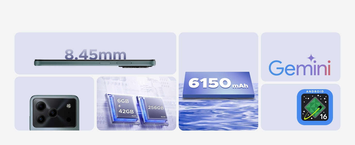 Duży Ekran 6.56" HD+ IPS z Odświeżaniem 90Hz oferuje płynne animacje i jasność 400 cd/m², co zapewnia komfortowe oglądanie filmów czy scrollowanie. Smukła Obudowa 8.5mm z ergonomicznym designem (163.8 x 75.8 mm) mieści się wygodnie w dłoni. Wodoodporny notch (Waterdrop) i certyfikaty bezpieczeństwa sprawiają, że telefon jest wytrzymały na codzienne wyzwania – bez kompromisów w stylu.