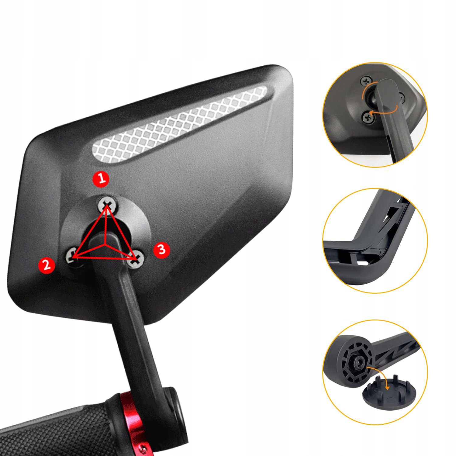 Lusterko rowerowe ma trzy śruby z tyłu, które można ponownie dokręcić po długim czasie użytkowania. Wewnątrz ramię lusterka rowerowego ma modną i stabilną pustą strukturę. Solidna konstrukcja zapewnia, że lusterko rowerowe nie chwieje się, nie pęka ani nie łamie.