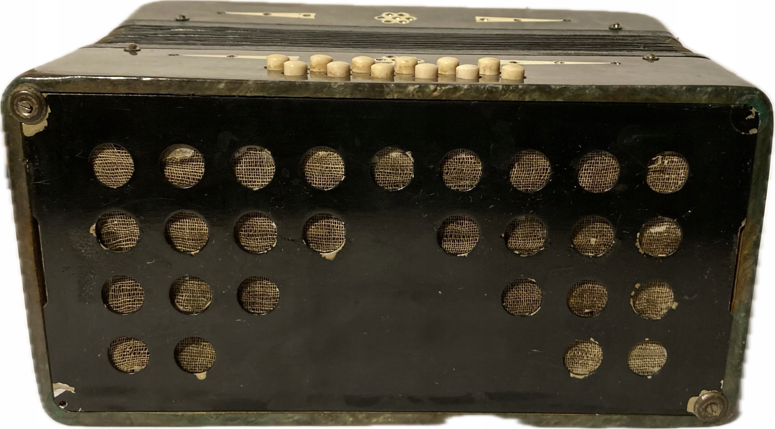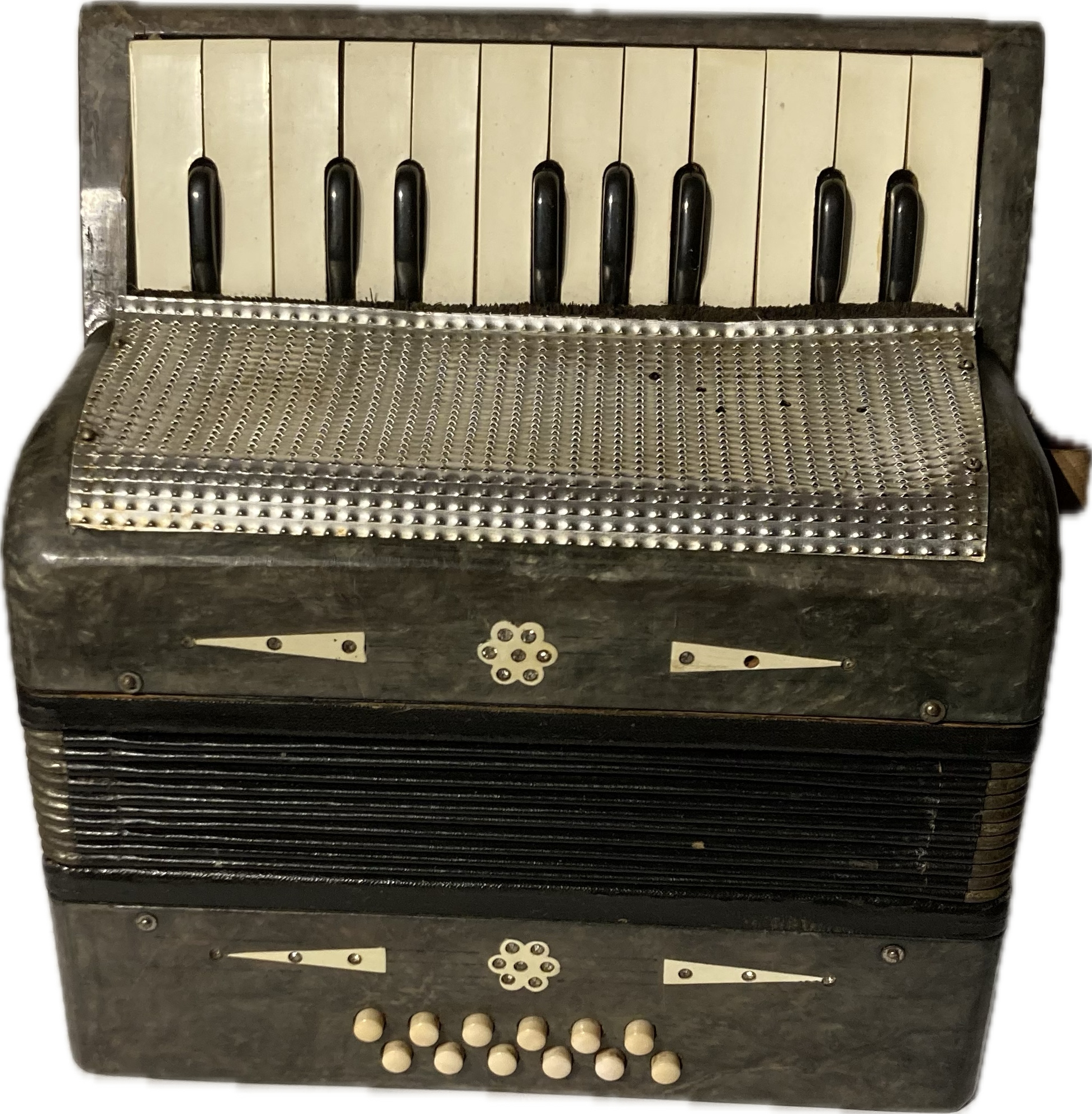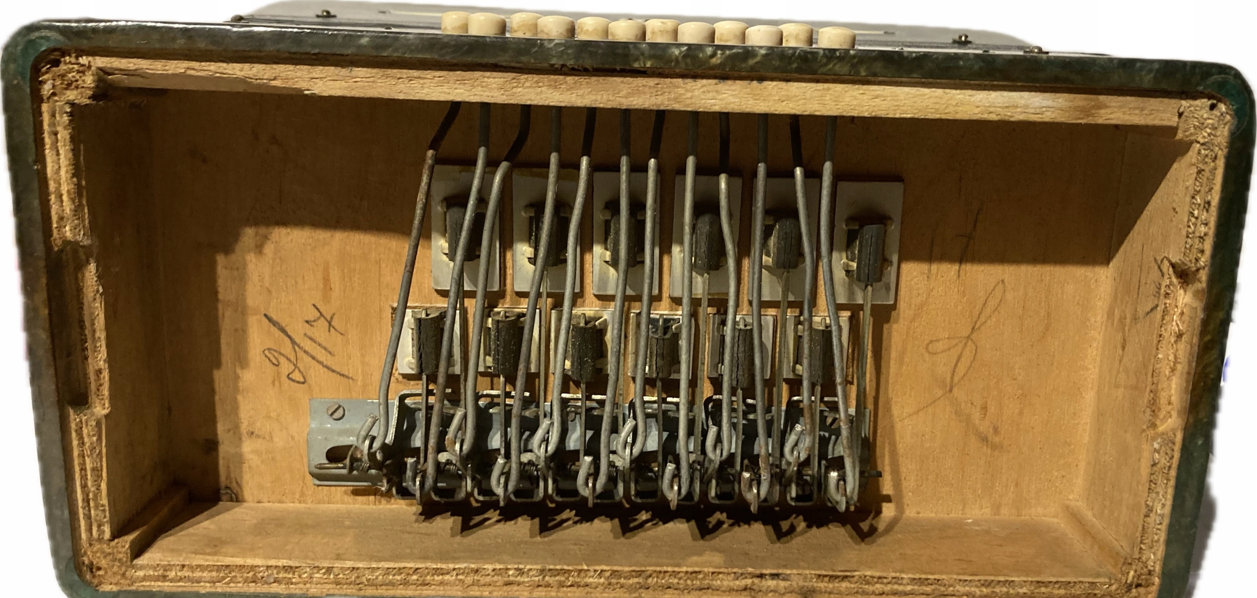 Wszystkie klawisze działają, miech szczelny, instrument gra głośno i wyraźnie, ale pewnie wymaga nastrojenia.