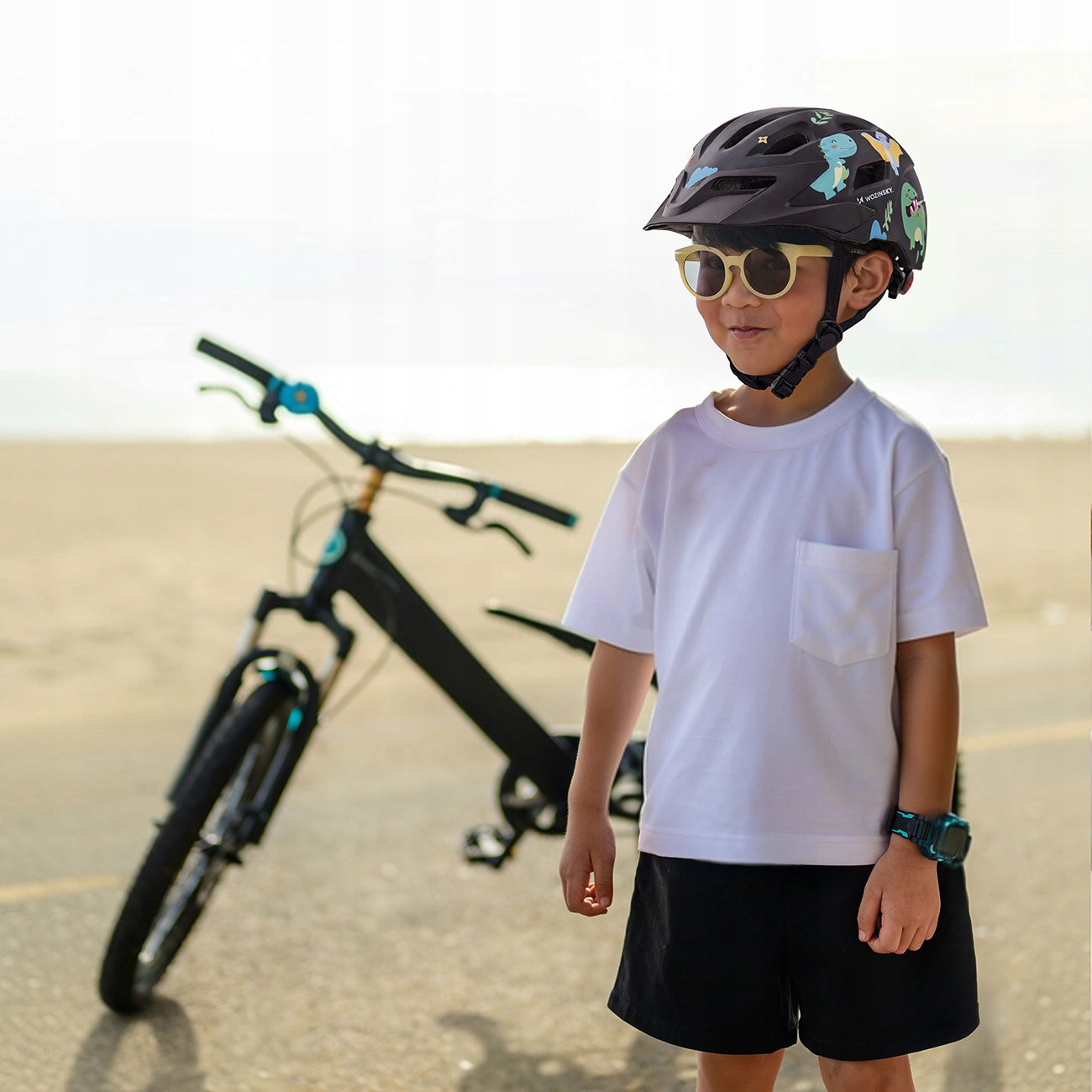 ➡️ Kolorowy nadruk w dinozaury sprawia, że kask wygląda jak element zabawy, a nie obowiązek