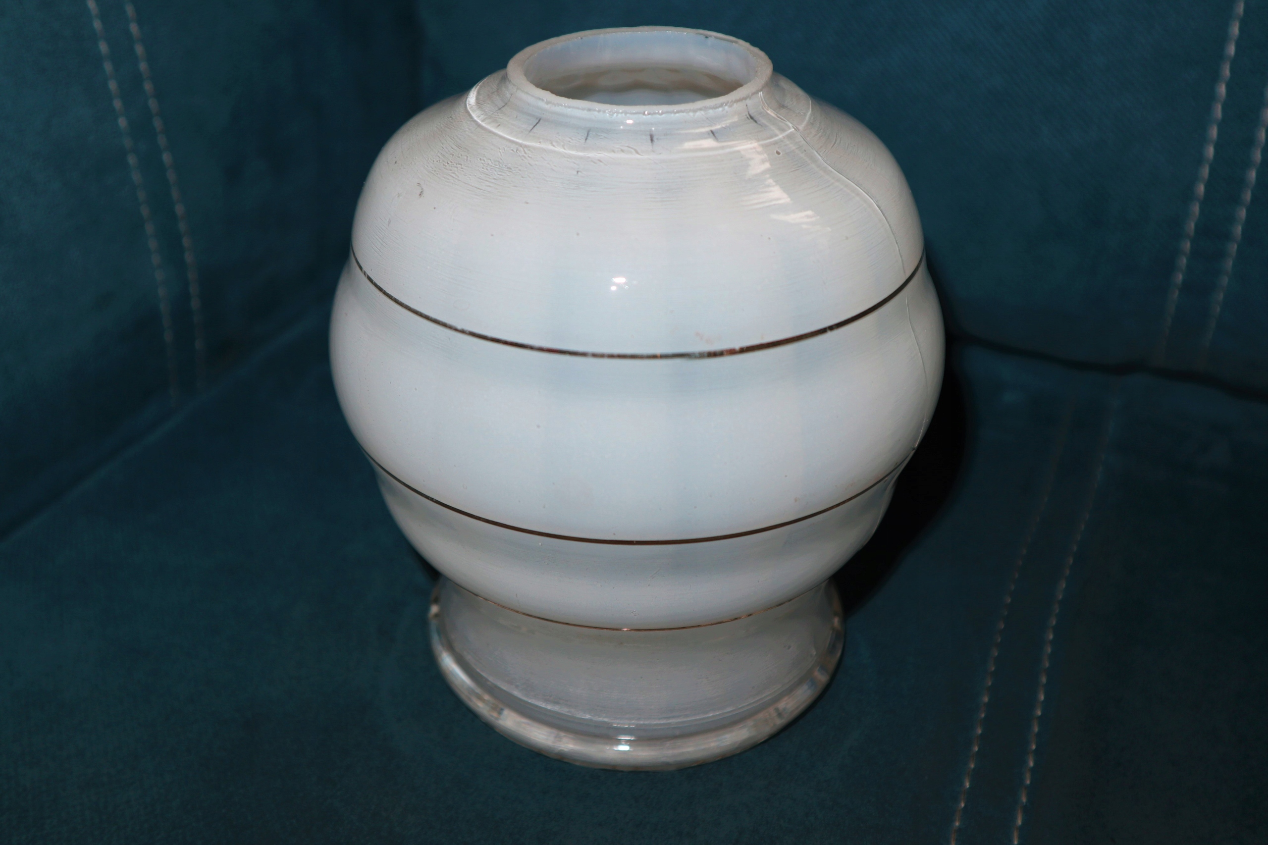 ŚLICZNY STARY KLOSZ MLECZNO BIAŁY ZE ZŁOTYMI PASKAMI BEZ PĘKNIĘĆ I WYSZCZERBIEŃ WYS 15 cm ,ŚR MONTAŻOWA 4,5 cm . STAN JAK NA FOTO . MIŁEJ LICYTACJI