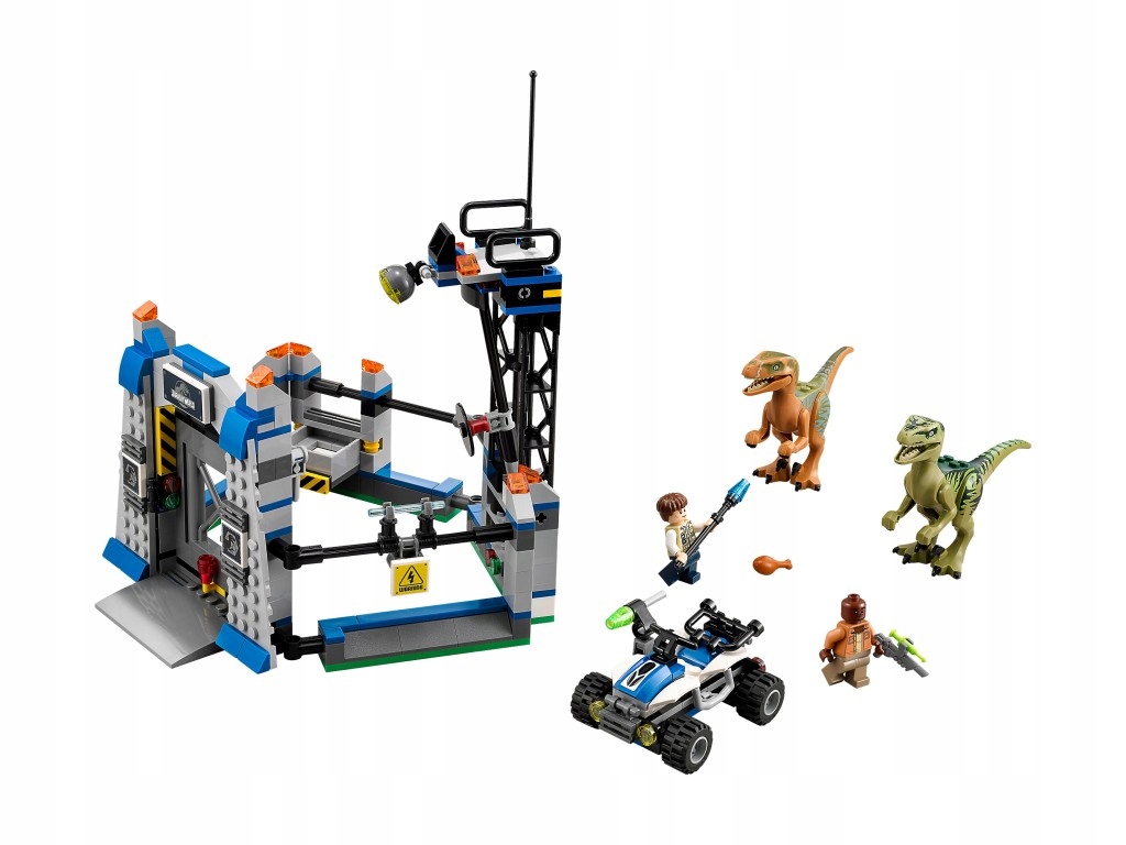 O nie — w parku Jurassic World mamy podwójny kłopot! Jeden z raptorów uciekł z zagrody i teraz grasuje na wolności. Wskocz do niezwykle szybkiej terenówki i ruszaj w pościg. Okiełznaj niebezpieczne zwierzę za pomocą pocisku z miotacza oraz pręta elektrycznego żołnierza ACU. Tymczasem drugi raptor uruchomił mechanizm zapadni i sprawił, że do jego zagrody wpadł treser. Ruszaj na pomoc nieszczęśnikowi, zanim raptor schwyta go w swoją paszczę. W zestawie 2 minifigurki z bronią i dodatkami: żołnierz ACU oraz treser.