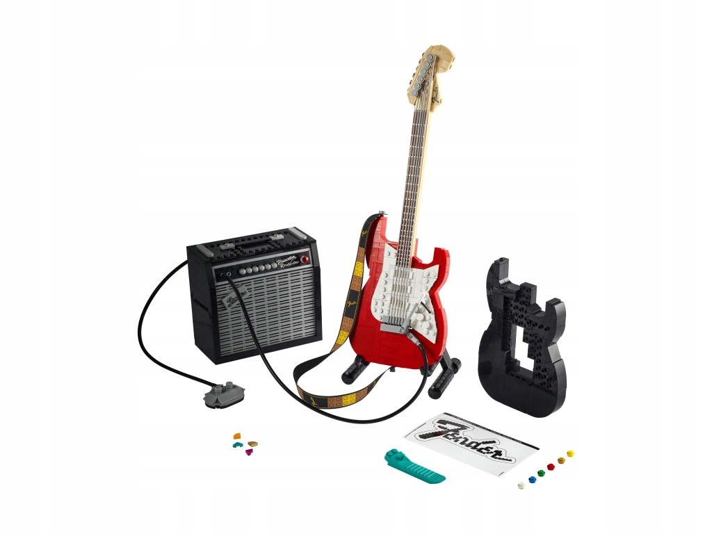 Atrakcyjna ozdoba kolekcji Zestaw zawiera klocki potrzebne do zbudowania czerwonej lub czarnej gitary, kostek do gitary w czterech kolorach oraz eleganckiej, składanej podstawki, która dopełnia całości tego przepięknego modelu kolekcjonerskiego. W komplecie jest również naklejka z logo marki Fender z klocków LEGO, którą możesz nakleić na swoją prawdziwą gitarę lub wzmacniacz.