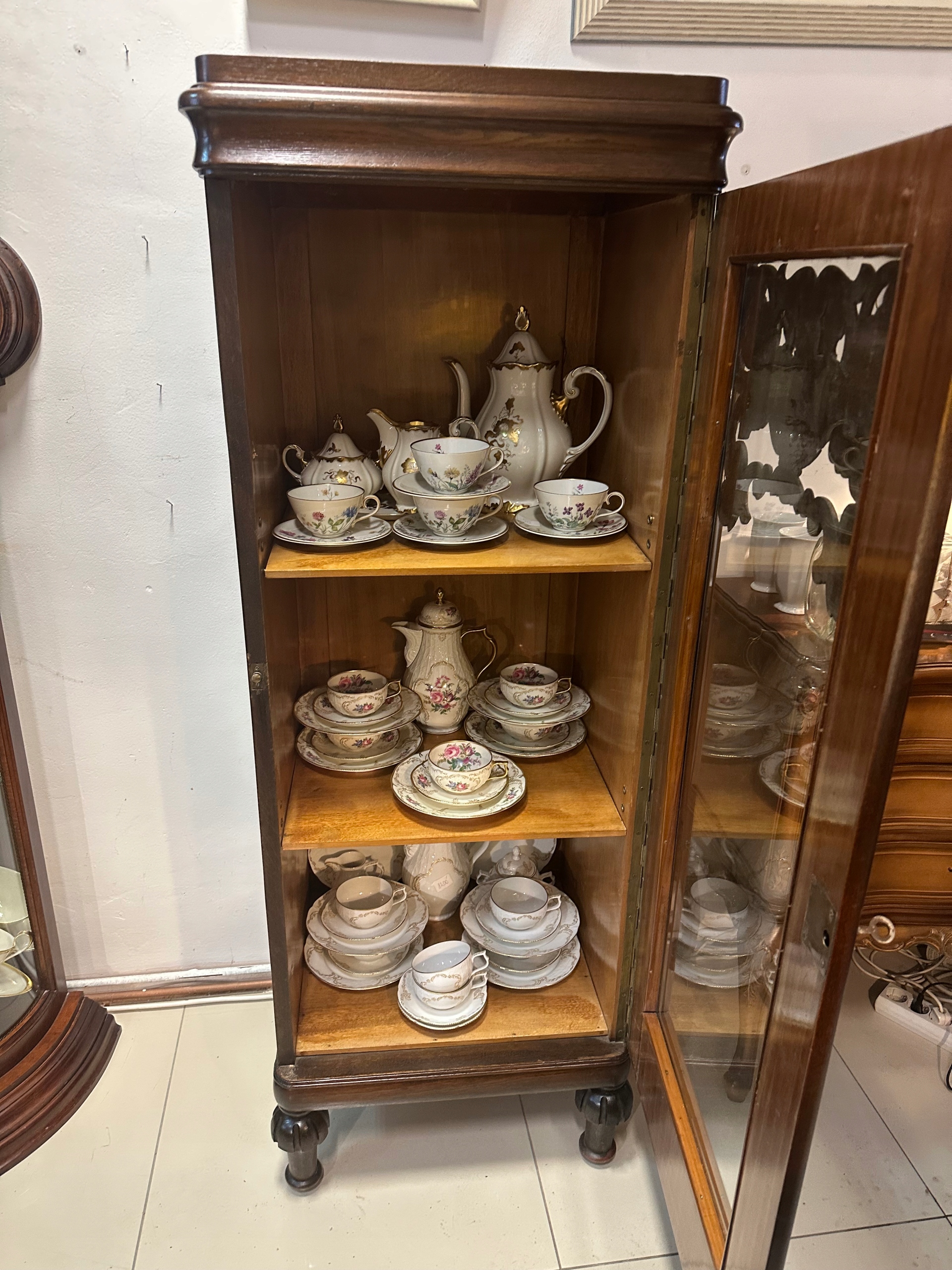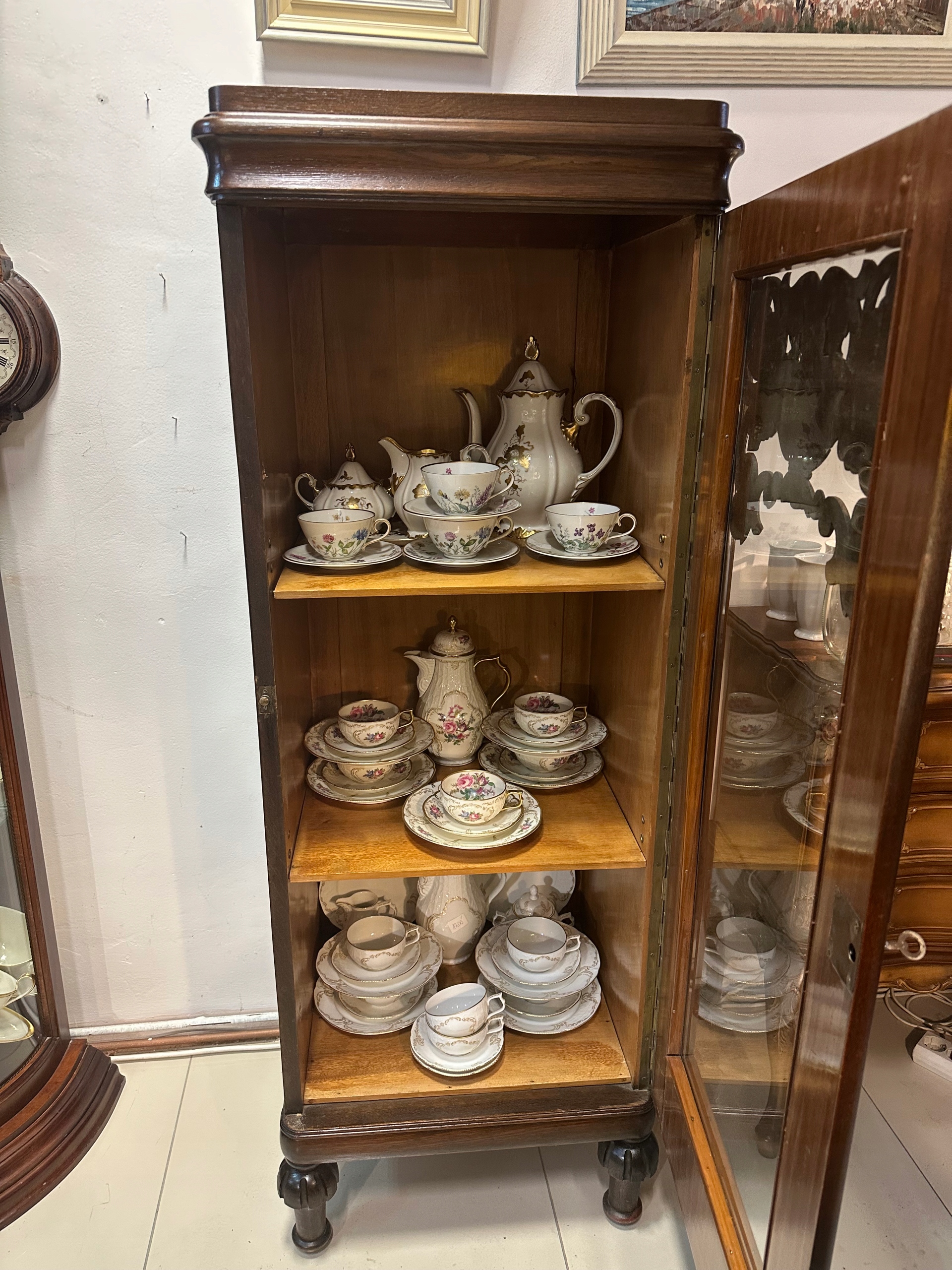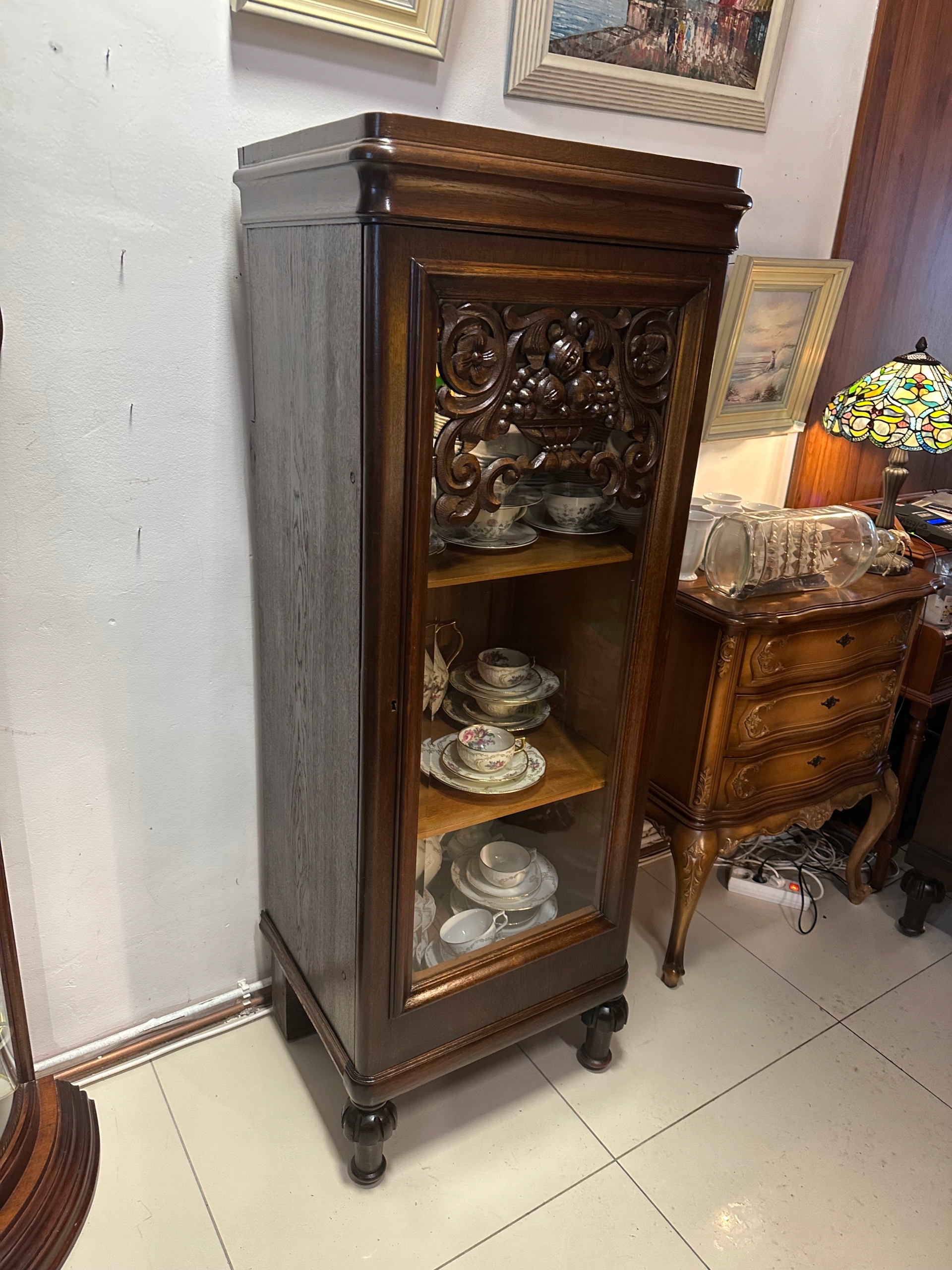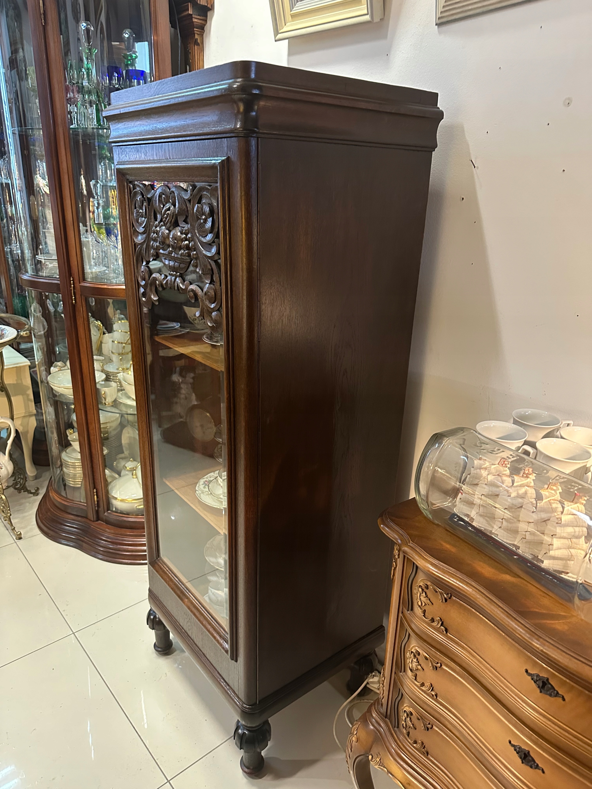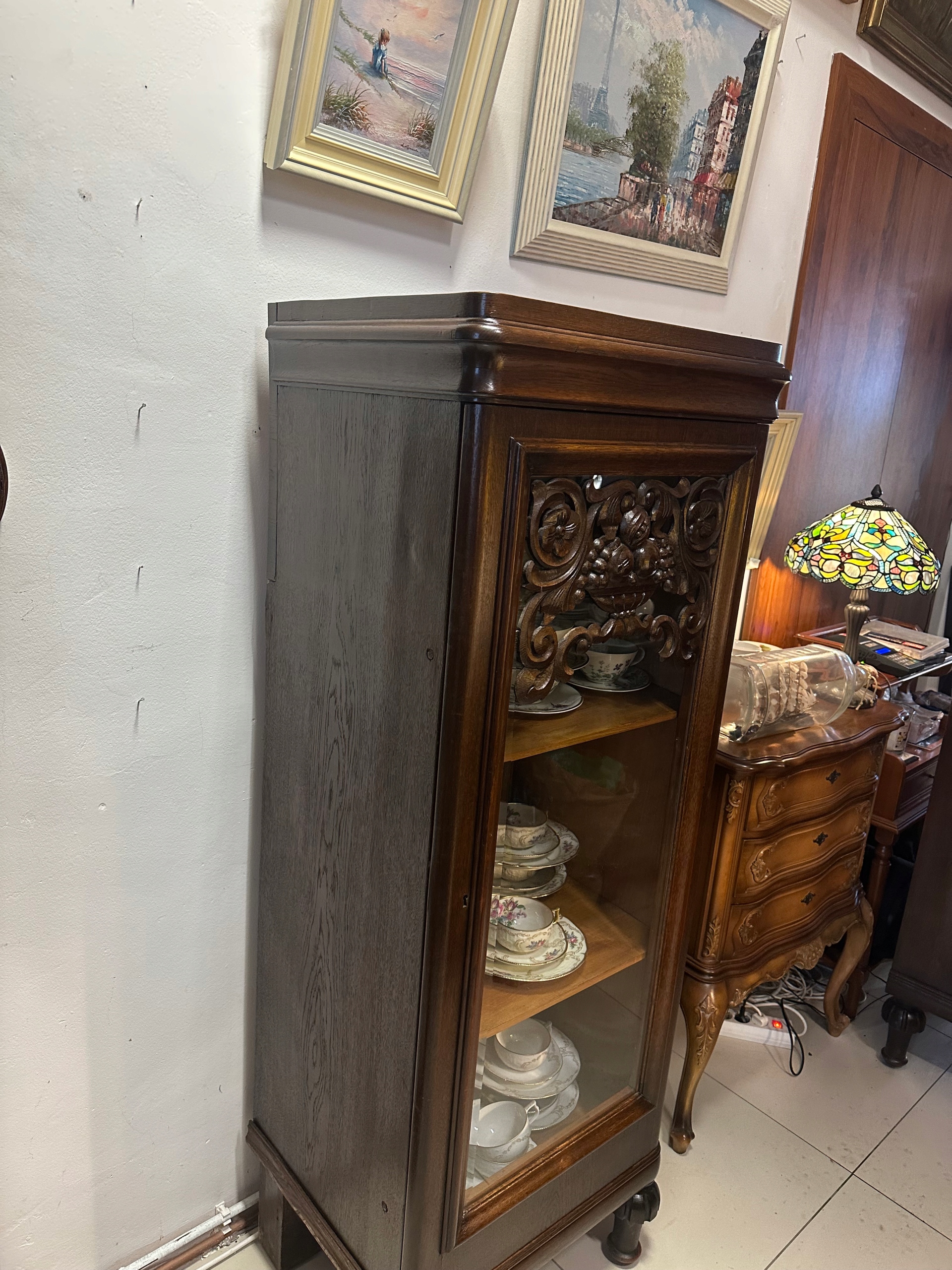 Piękna Witryna Serwantka dębowa z lat 1920/30 . Piękny kształt urocze zdobienia drewno koloru ciemny dąb . Witryna 1 drzwiowa wykonana w staranny sposób. Mebelek w bdb stanie do natychmiastowego użytkowania, piękny kształt . Witryna w super stanie. Drzwi otwierane w prawą stronę. Polecam.Możliwe niewielkie ślady użytkowania z racji wieku oczywiście