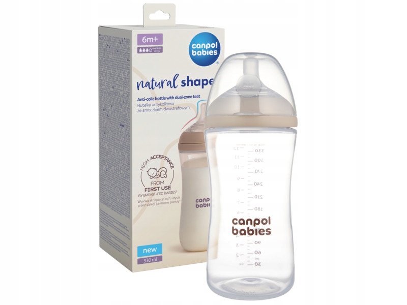 Butelka CANPOL BABIES Natural Shape jest odpowiedzią na potrzeby rodziców karmiących na przemiennie i mam karmiących piersią inaczej. Butelka jest wyposażona w smoczek dwustrefowy z technologią DuoFlex: elastyczna końcówka naśladuje brodawkę, stabilna baza umożliwia szczelne ułożenie ust na smoczku. Umożliwia naturalne i szerokie ułożenie warg na smoczku "jak u rybki", płynne ssanie bez przerw i połykania powietrza wpływa na redukcję kolki i rozdrażnienia. Wzmocniona strefa dolna przypomina kształt piersi.