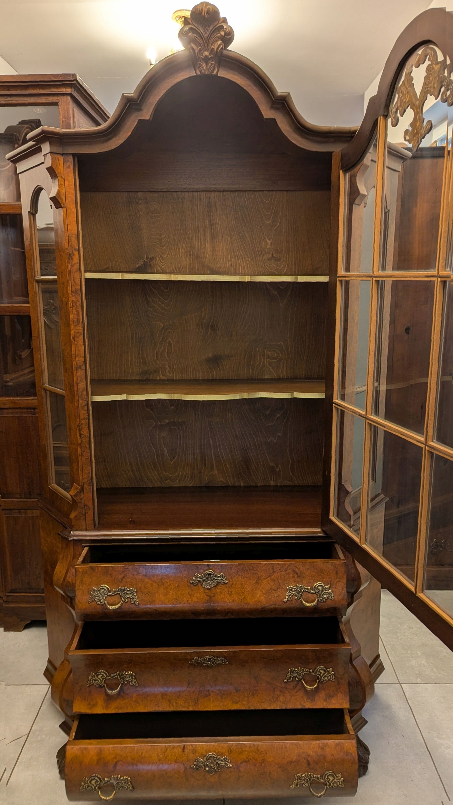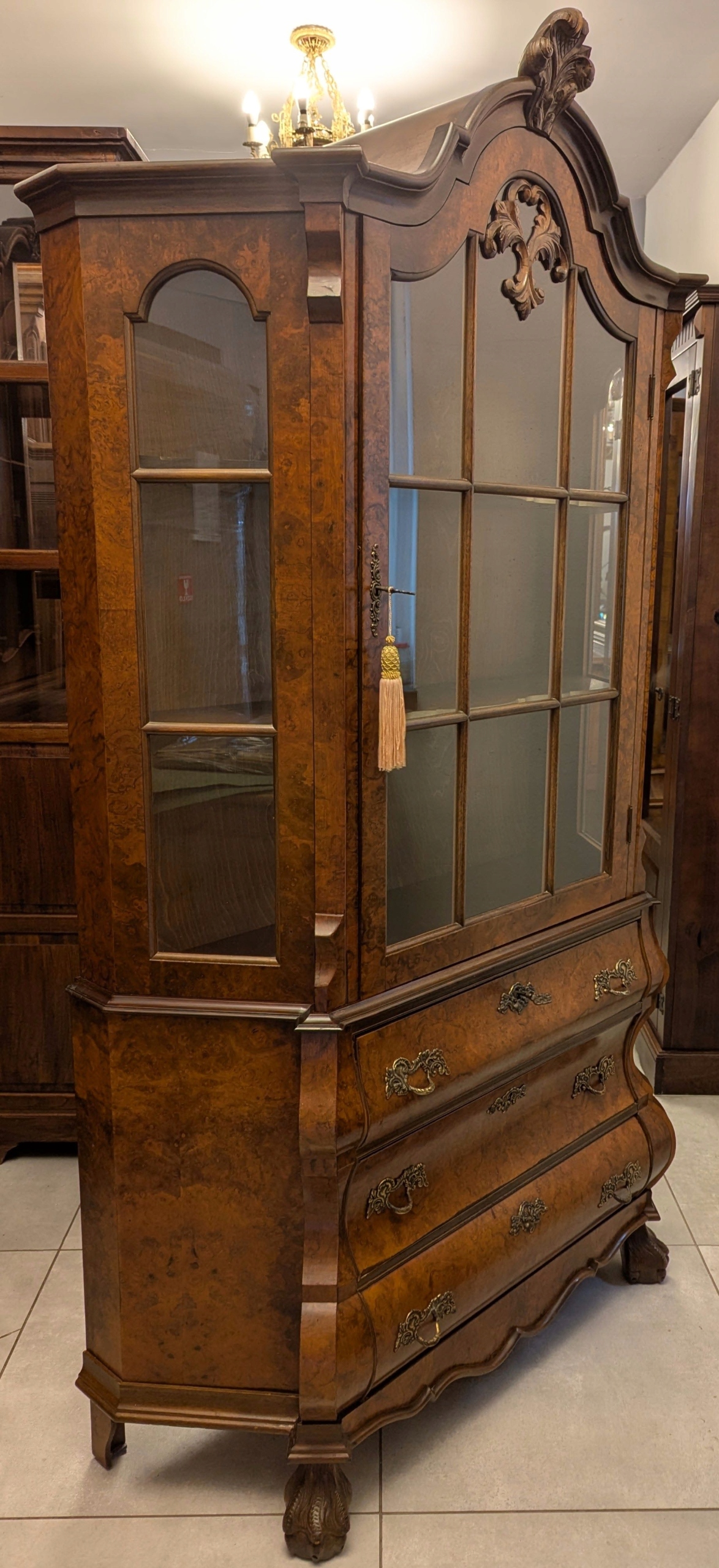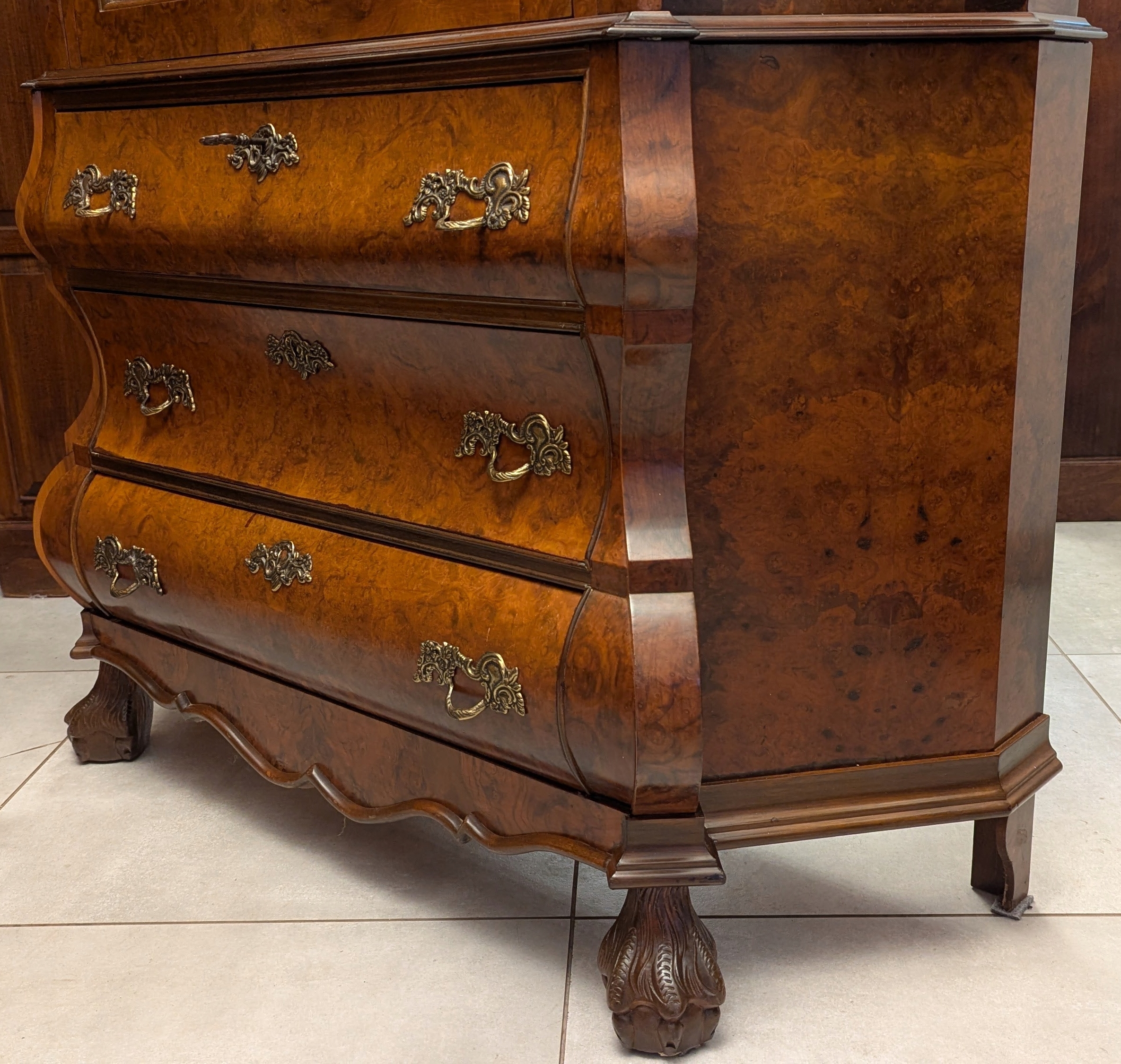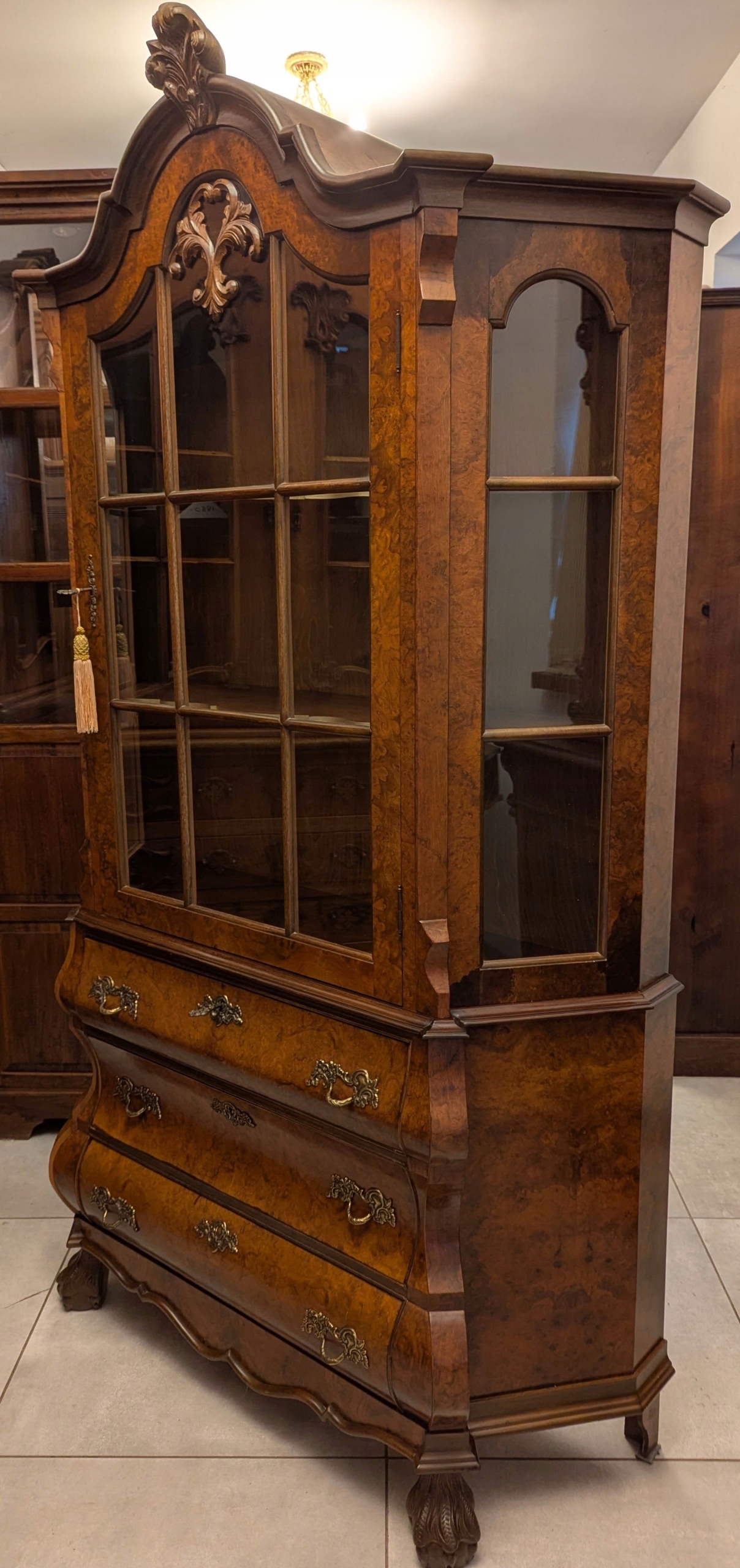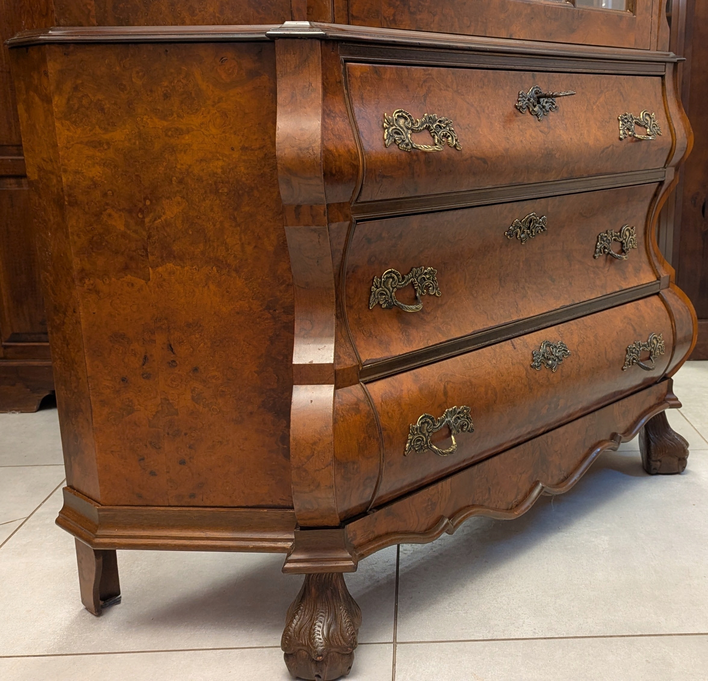 Zapraszam do obejrzenia bardzo pięknej witryny,serwantki neobarokowej.Mebel jest zdobiony czeczotą,ma pięknie wymodelowane kształty.Stan bardzo dobry.Wszystko czyste i świeże, nie ma śladów po drewnojadach .Wymiary: szer 109,5 cm., głębokość 40 cm., wys. 192,5 cm.