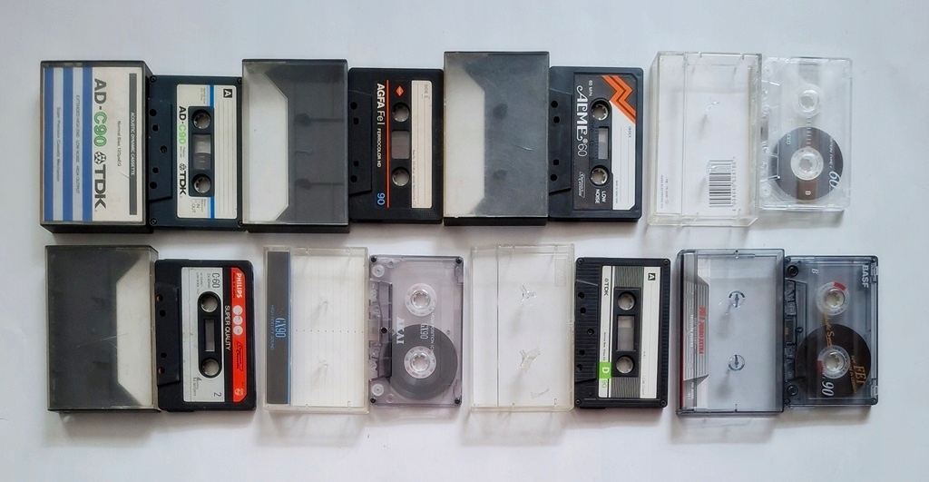 Kasety magnetofonowe 8 sztuk, BASF, TDK, Agfa, Akai, Philips i inne. Używane, długości 3 sztuki C-60 i 5 sztuk C-90, wszystkie z pudełkami, dokładnie to, co widać na zdjęciu, na kasetach może być na coś nagrane.