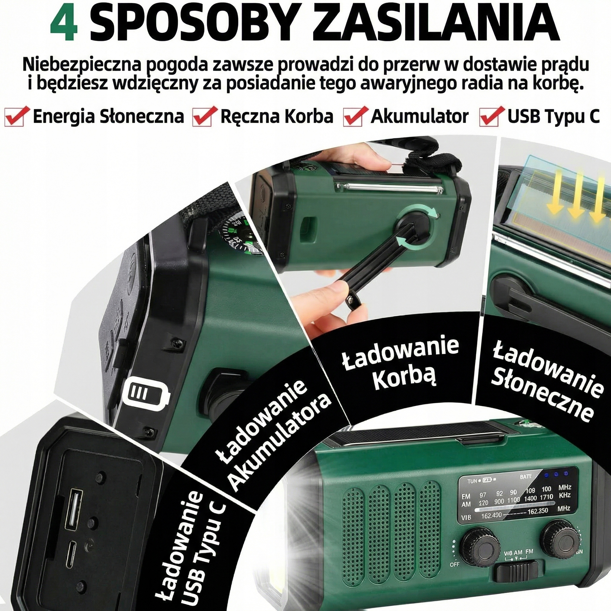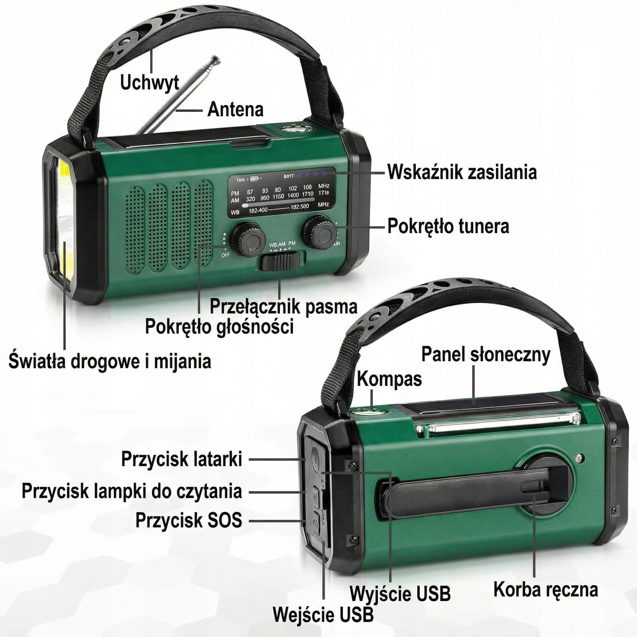 Mimo minimalistycznego designu, urządzenie oferuje bogactwo funkcji, takich jak radio, latarka, ładowarka, alarm SOS i kompas, zapewniając kompleksowe wsparcie w każdej sytuacji.