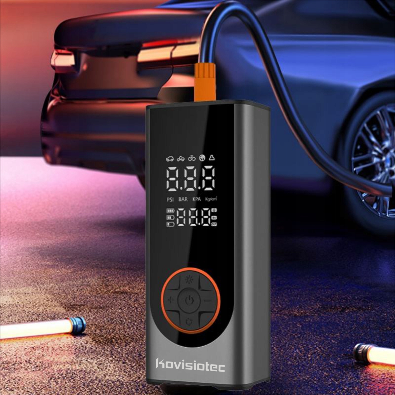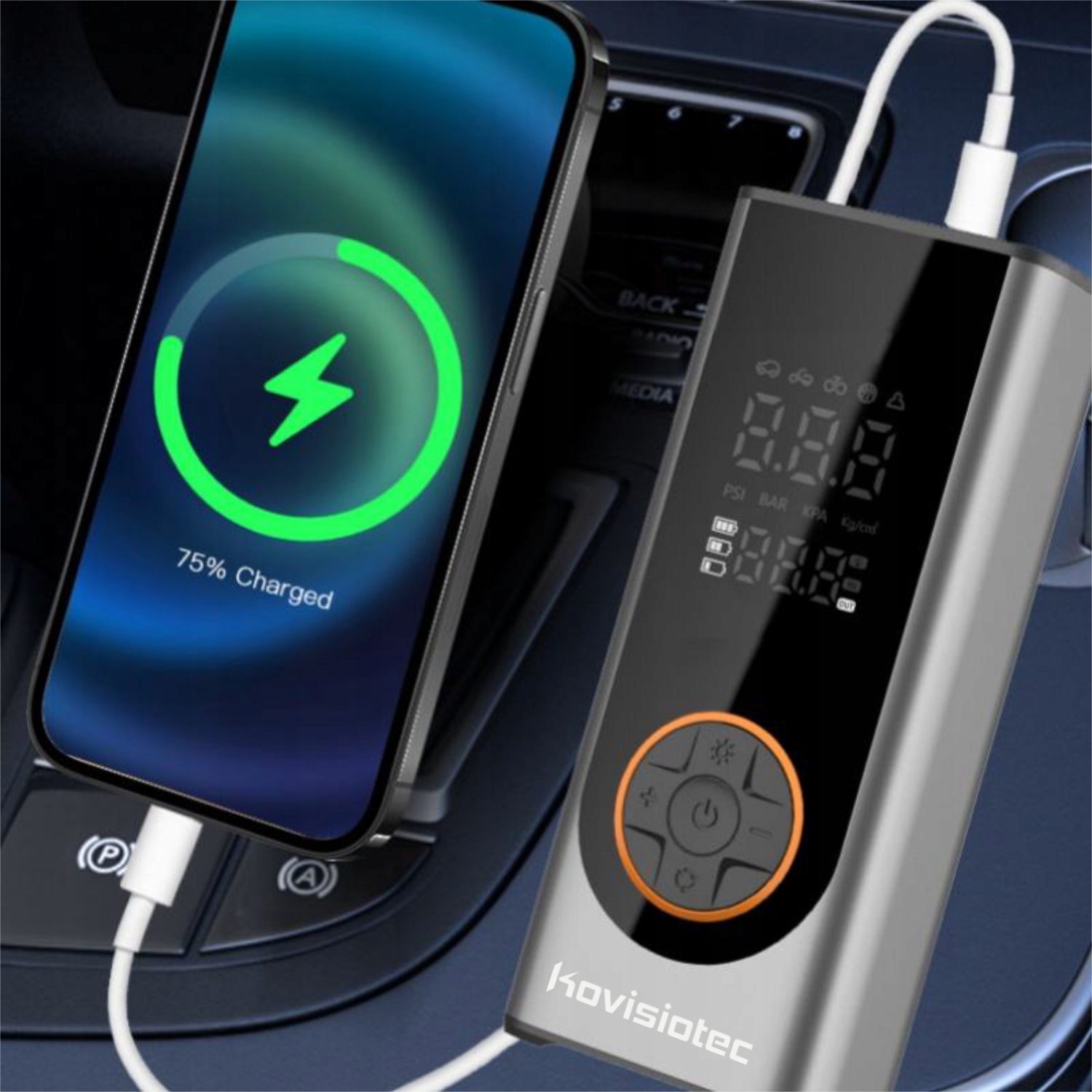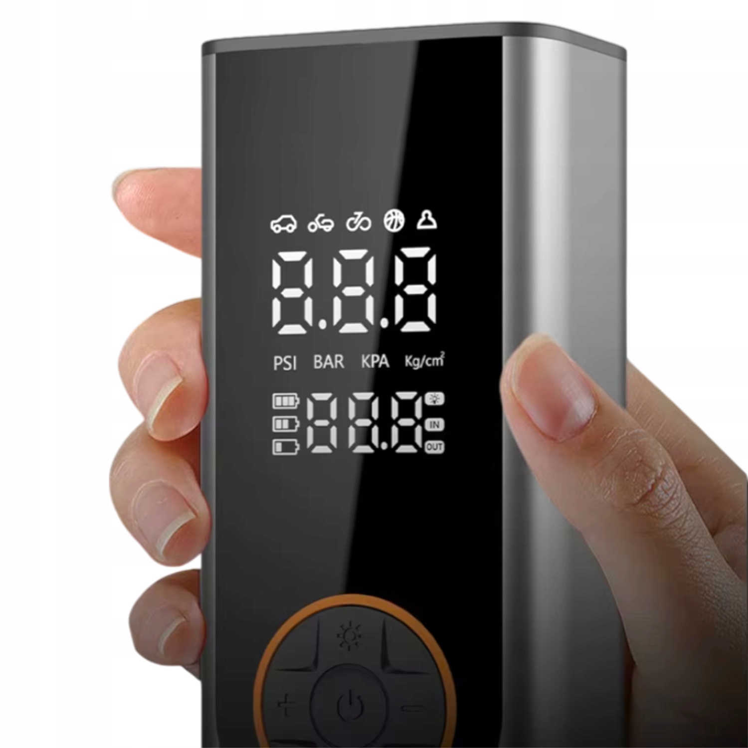 Ta kompaktowa pompka została zaprojektowana z myślą o pełnej niezależności – działa bezprzewodowo na akumulatorze, a gdy tego potrzebujesz, możesz podłączyć ją do gniazda 12V w samochodzie i kontynuować pompowanie.