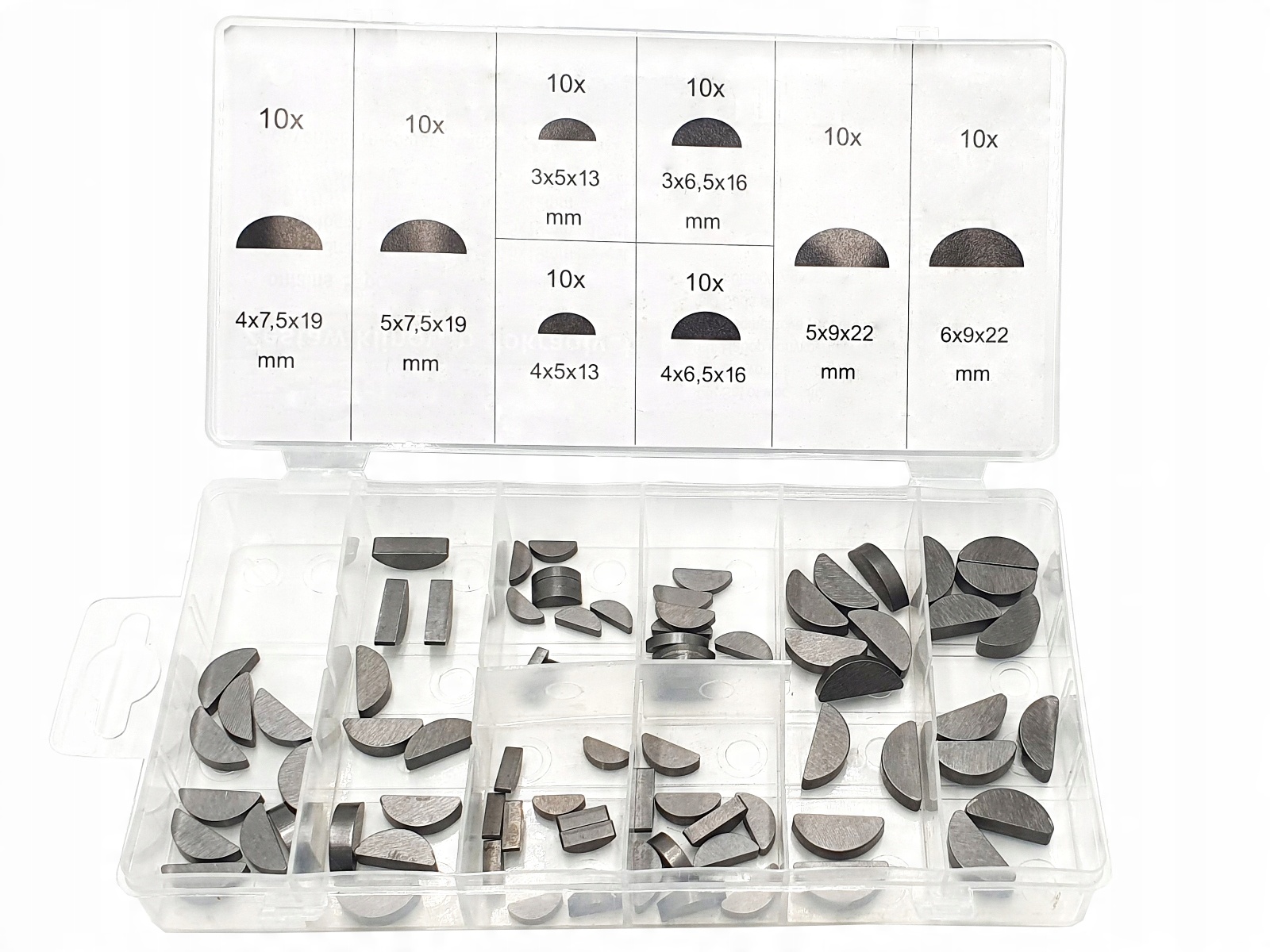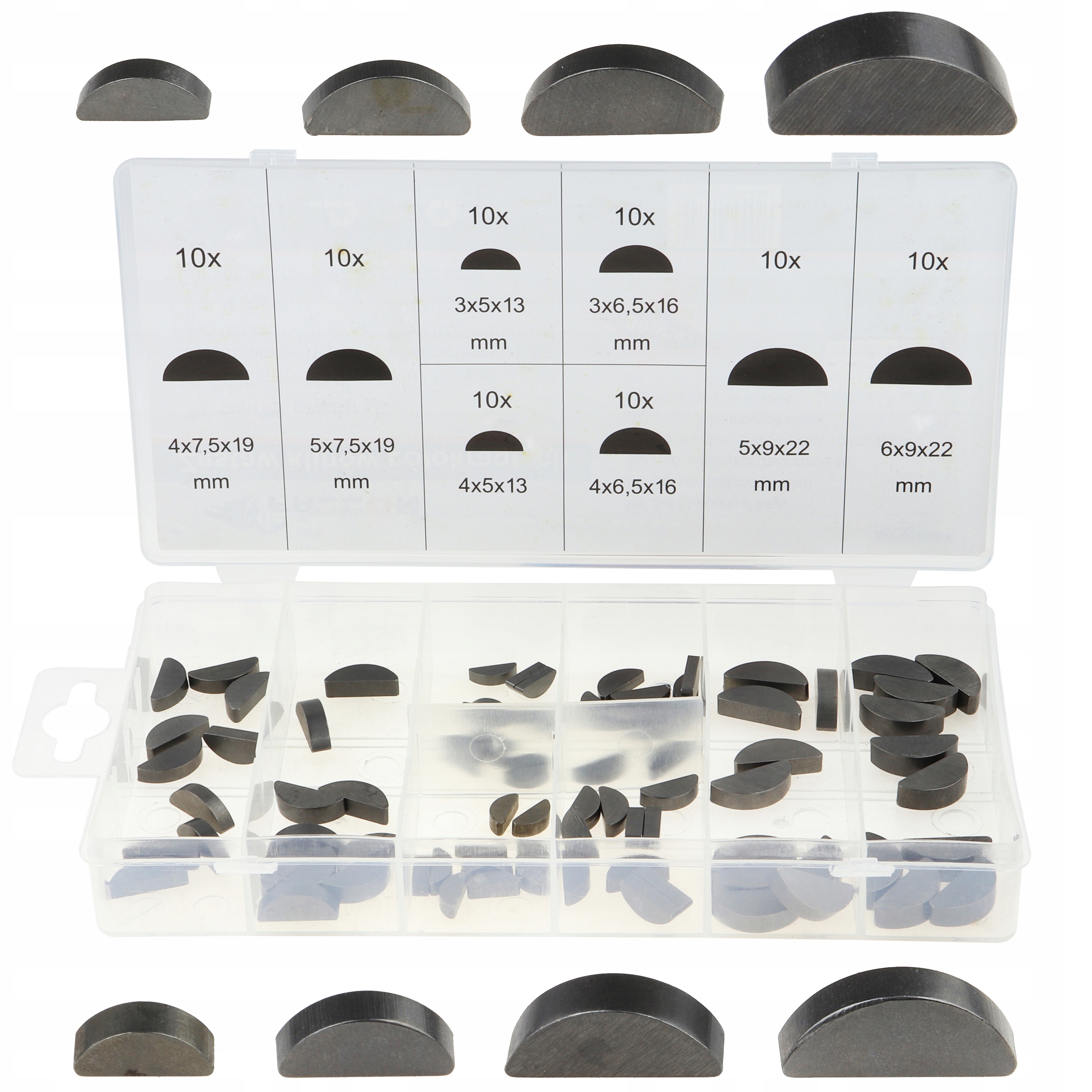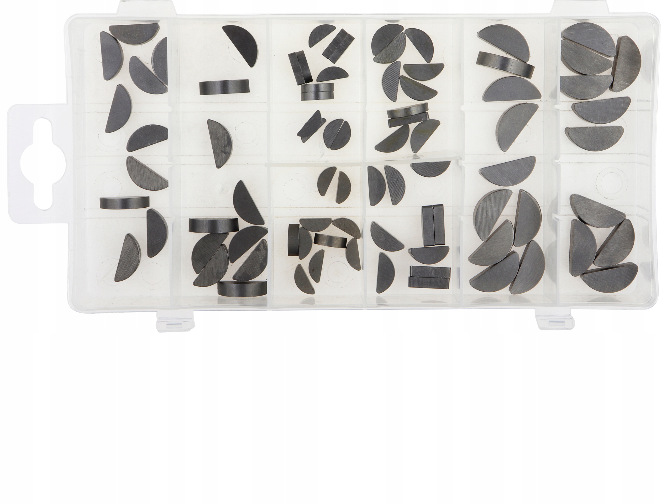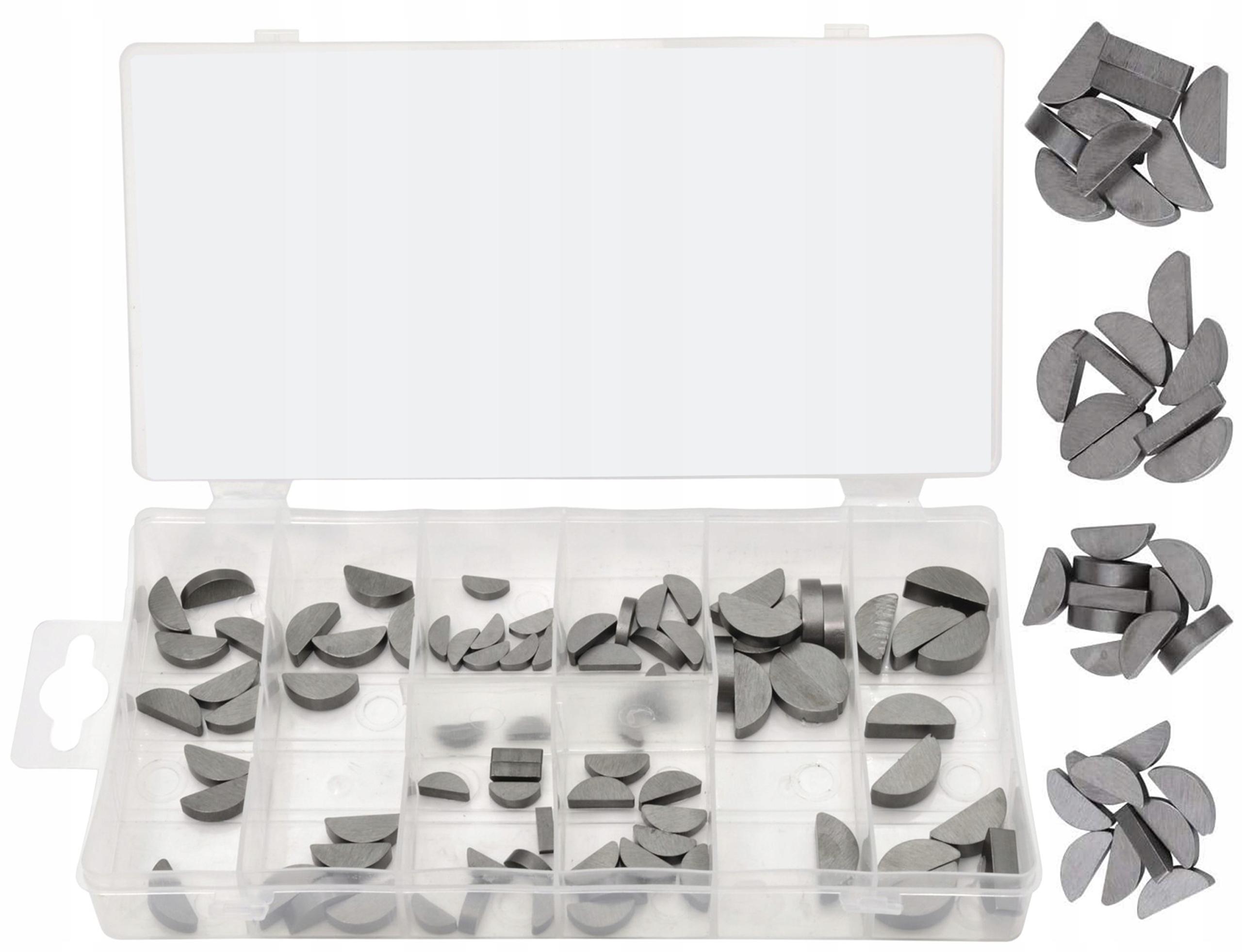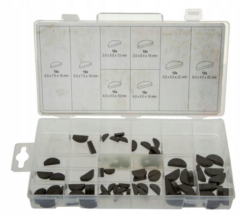 ZESTAW KLINÓW PÓŁOKRĄGŁYCH CZÓŁENKOWYCH – 80 SZTUK to komplet elementów do łączenia wałów z piastą. Kliny typu czółenkowego (Woodruff) zapewniają stabilne i precyzyjne osadzenie elementów mechanicznych. Wykonane z trwałego materiału, przystosowane do pracy w układach napędowych. Całość zapakowana w praktyczne pudełko typu sorter.