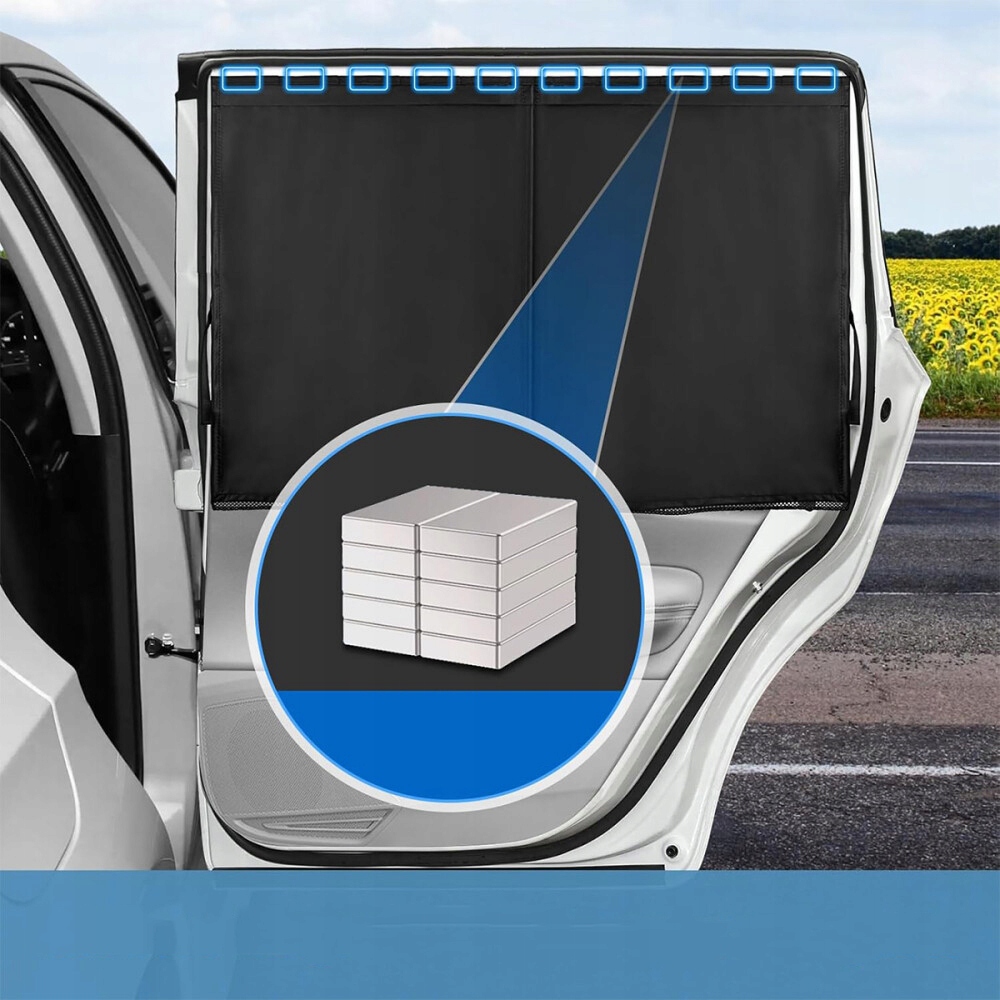 Ochrona powierzchni i materiału:Zapewnia pełną ochronę przed słońcem dzięki warstwowej siatce, jest w pełni oddychająca i pozostaje wewnątrz ramy okna. Pozwala to na normalne otwieranie i zamykanie szyb, ciesząc się wiatrem na zewnątrz i komfortowym widokiem w cieniu. Dzięki temu w kabinie panuje chłód i większy komfort, a wykończenie wnętrza samochodu wolniej się starzeje.