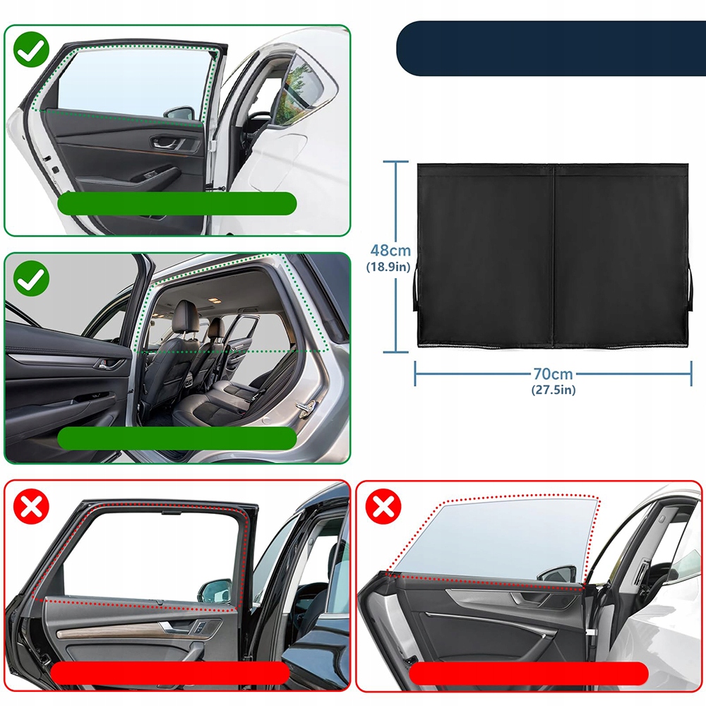 Rolety przeciwsłoneczne na szyby samochodowe– 1 para – Pasują do małych i średnich crossoverów, SUV-ów, sedanów i ciężarówek. Nadają się do zakrzywionych/prostokątnych/trapezowych tylnych bocznych szyb. Pasują do okien o wymiarach: ok. 70 cm (dł.) x 48 cm (wys.).
