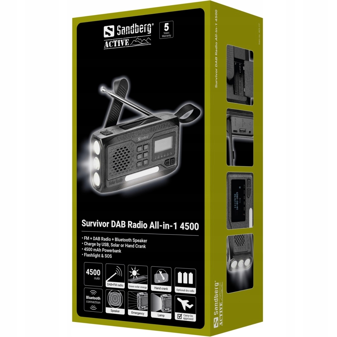 Sandberg Survivor DAB Radio All-in-1 4500 to kompaktowe urządzenie przygotowane do użytkowania w terenie oraz w sytuacjach awaryjnych. Łączy funkcję radia DAB+ i FM, głośnika Bluetooth oraz powerbanku. Niewielkie wymiary i masa 273 g sprawiają, że bez trudu zmieści się w plecaku wyprawowym lub zestawie ewakuacyjnym.