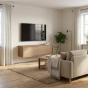 Wisząca szafka RTV to mebel, który łączy nowoczesną formę z przytulnym charakterem drewna. To idealna propozycja dla osób, które chcą wprowadzić do swojego wnętrza ciepło i naturalny klimat, nie rezygnując z praktycznych rozwiązań.