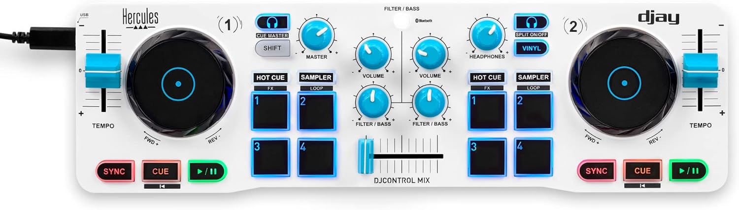 Kontroler DJ Hercules DJ Control Mix Blue umożliwia łatwe miksowanie muzyki bezpośrednio ze smartfonów i tabletów. Dzięki technologii Bluetooth, połączenie z urządzeniami mobilnymi jest szybkie i bezproblemowe. W zestawie znajduje się składana podstawka, która stabilnie utrzyma Twój smartfon lub tablet podczas pracy.