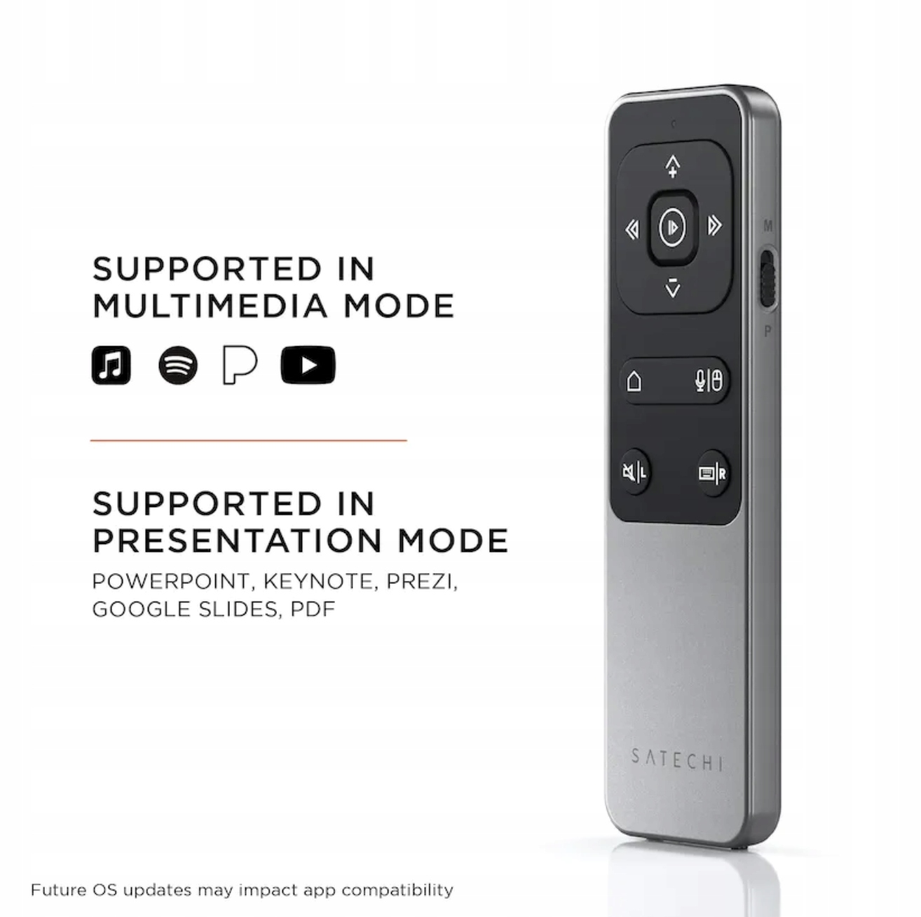 Urządzenia z roku 2011 i starsze nie są kompatybilne ze względu na chipset Bluetooth. Do obsługi programu PowerPoint potrzebna jest aktywna subskrypcja Office365. W trybie prezentacji pilot obsługuje: PowerPoint, Keynote, PDF, Google Slides i Prezi. W trybie multimedialnym pilot obsługuje: Apple Music, Spotify, Pandora, YouTube* i większość aplikacji do odtwarzania multimediów. *Pilot nie obsługuje funkcji przewijania w aplikacji YouTube.