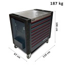 Profesjonalny wózek narzędziowy przeznaczony do intensywnej pracy na stanowiskach serwisowych oraz w warsztatach samochodowych. Konstrukcja wykonana z wysokiej jakości stali malowanej proszkowo zapewnia wysoką wytrzymałość oraz odporność na uszkodzenia mechaniczne i korozję. Wyposażony w 8 szuflad osadzonych na prowadnicach kulkowych, co gwarantuje płynne wysuwanie nawet przy dużym obciążeniu. Centralny zamek zabezpiecza zawartość, a skrętne koła z hamulcem umożliwiają stabilne i bezpieczne przemieszczanie wózka w miejscu pracy. Maksymalne obciążenie jednej szuflady wynosi 35 kg.