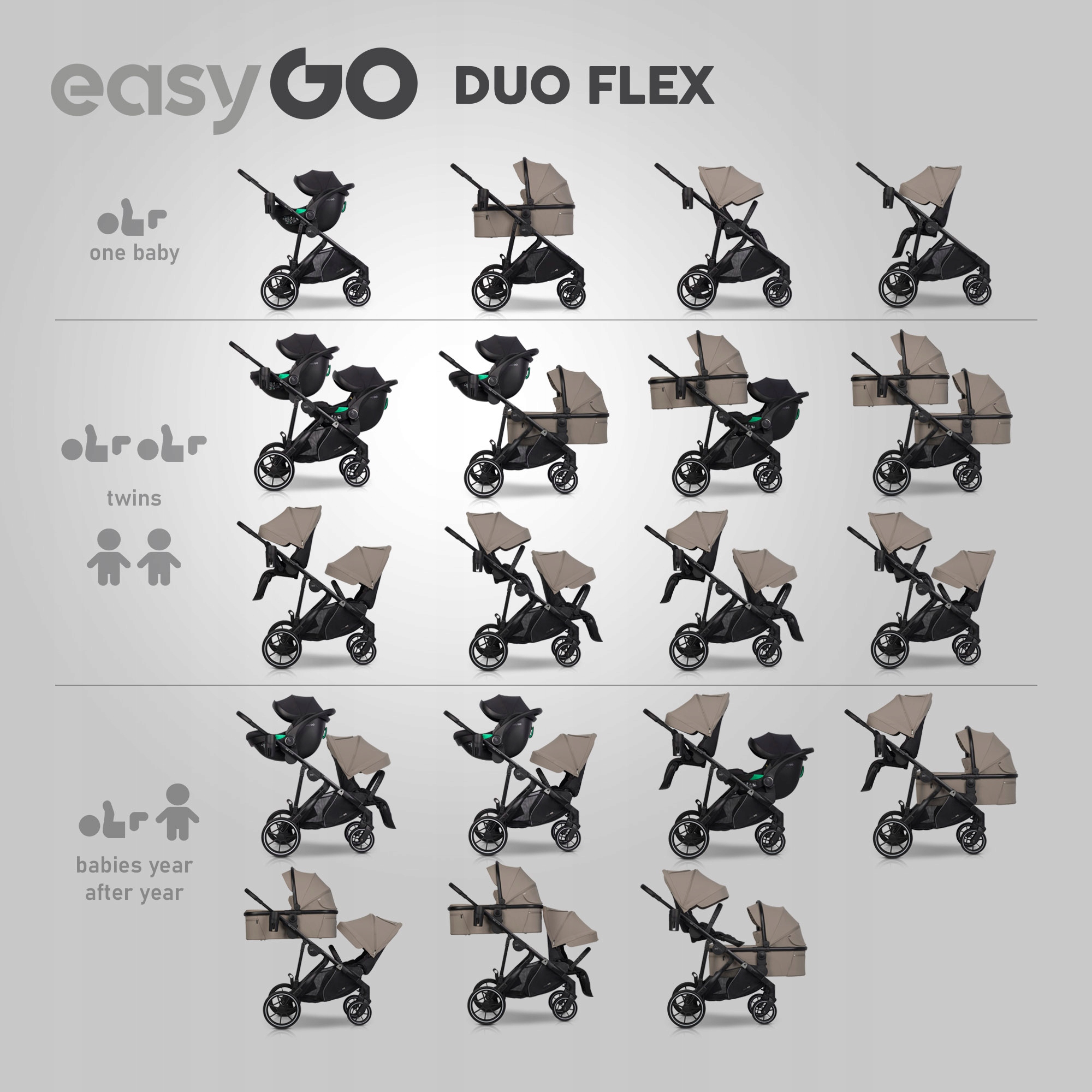 Ta innowacyjna zaawansowana technologicznie funkcja sprawia, że DUOFLEX marki EASYGO jest idealnym rozwiązaniem dla rodzin planujących drugie dziecko. Możemy stworzyć kilka kombinacji ustawienia wózka takich jak: