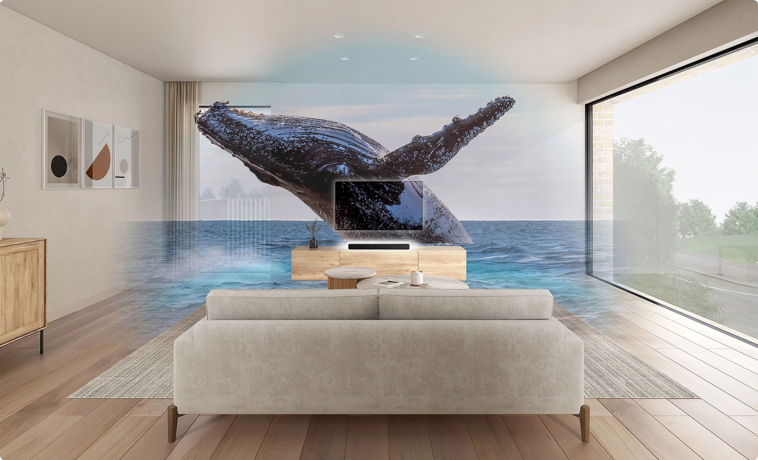 Dzięki połączeniu naszych najnowszych technologii akustycznych i przetwarzania sygnału możliwa jest rekonstrukcja rozległej przestrzeni dźwiękowej. Głośnik centralny zapewnia wyraźne dialogi, a dwa zintegrowane subwoofery gwarantują głęboki bas.