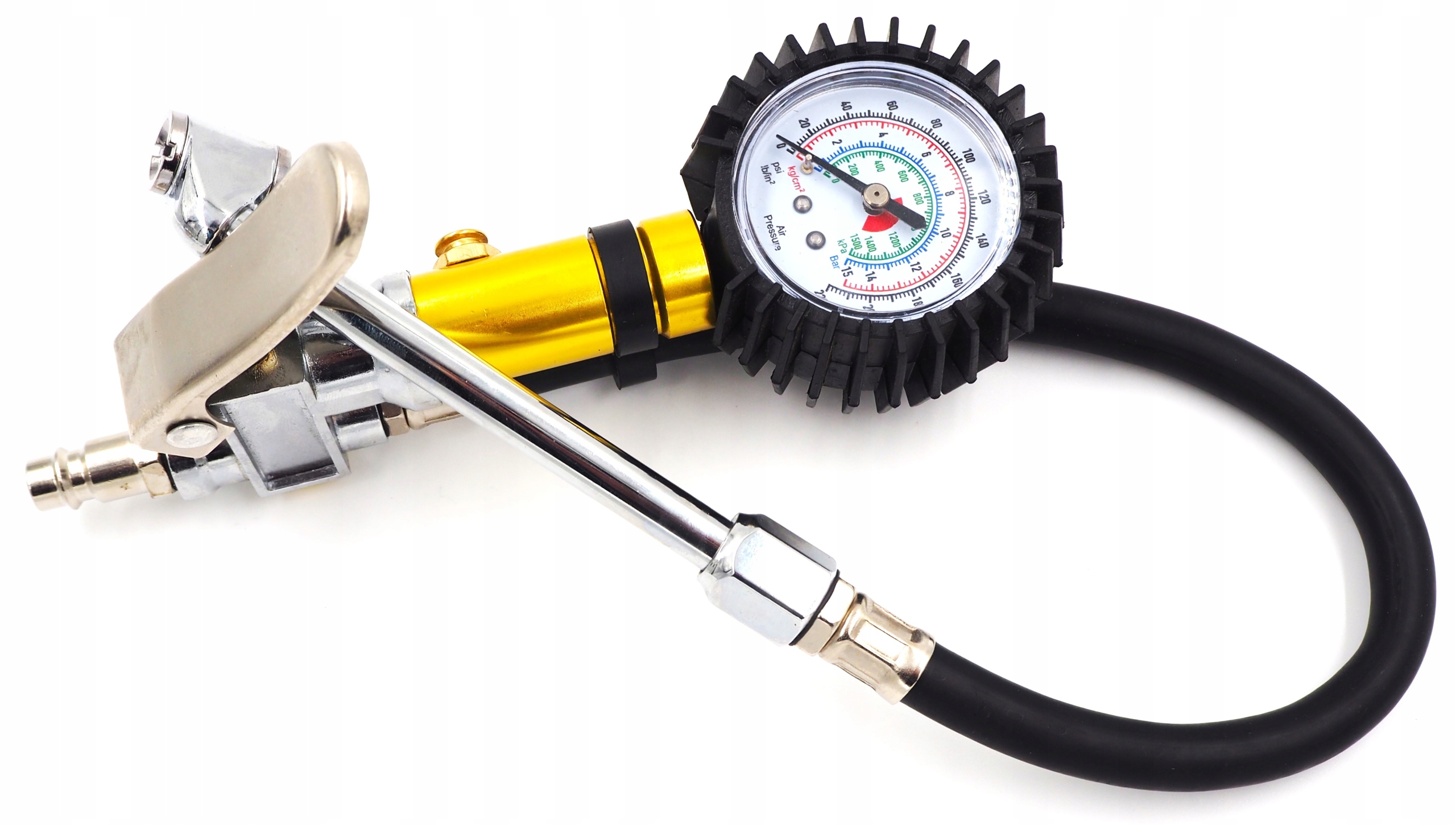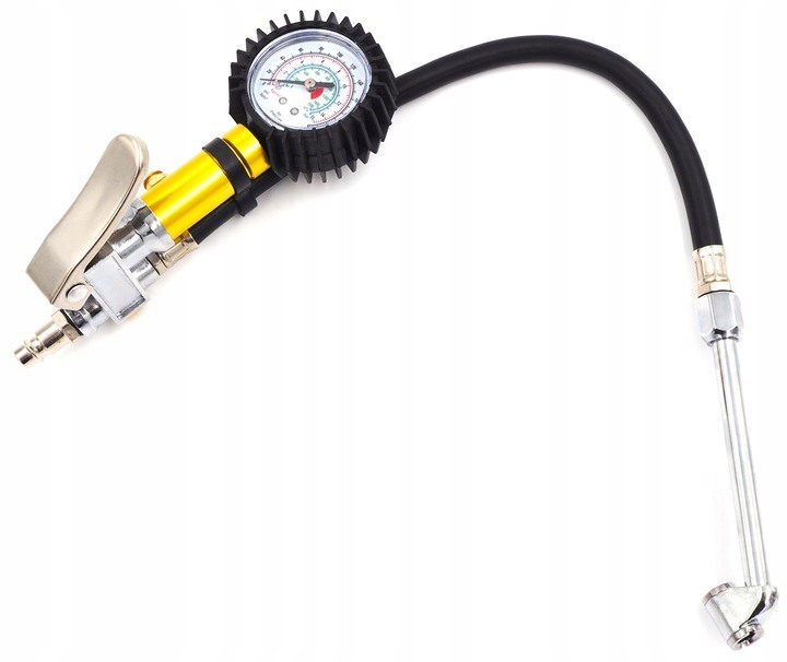 Wyposażony jest w manometr o zakresie 0–15 bar (0–220 PSI) z czytelną skalą oraz gumową osłoną zabezpieczającą przed uderzeniami. Posiada wąż z zakutą końcówką pasującą do standardowych wentyli samochodowych oraz funkcję spuszczania powietrza z opon.